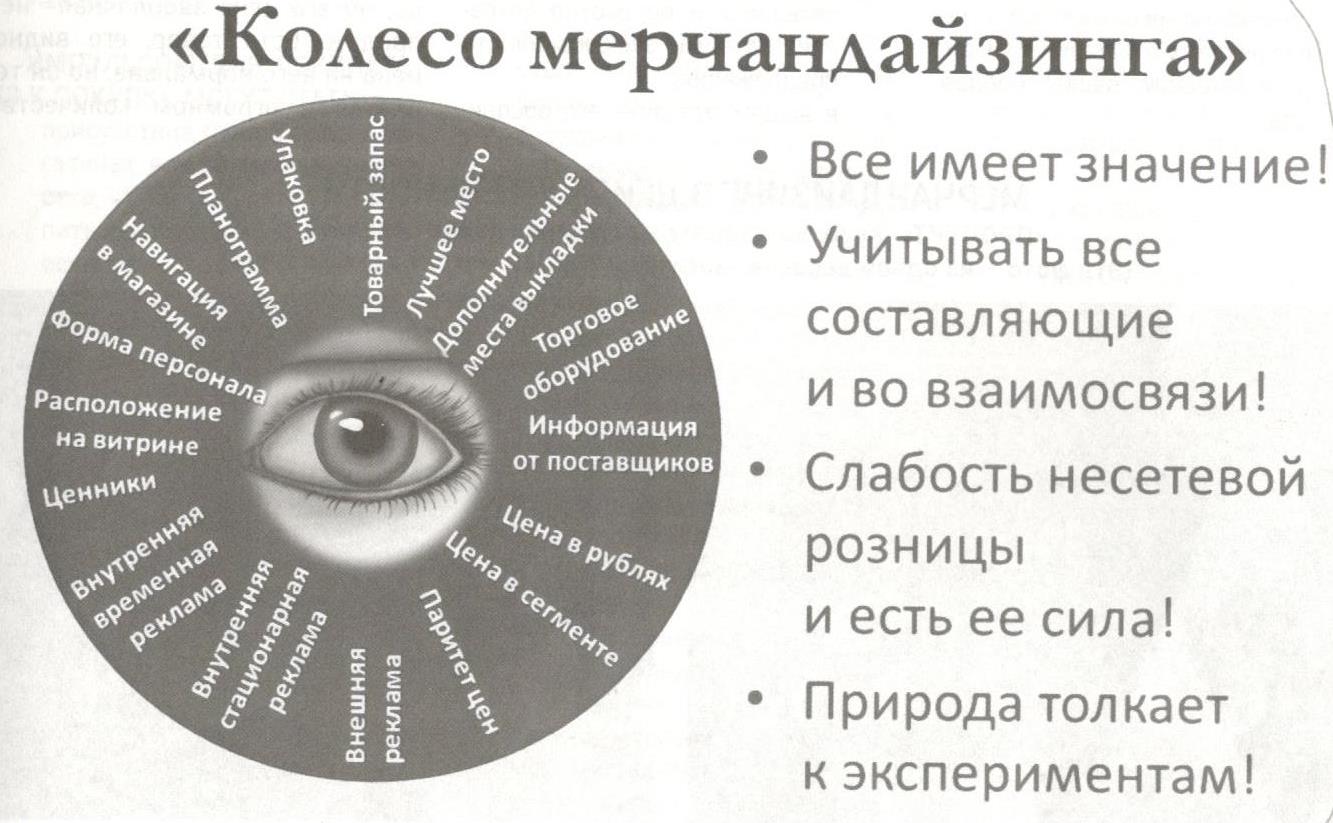 Вот подсказка про аспекты мерчандайзинга. Проверьте, как каждый пункт у вас сейчас выполнен и как способствует росту ваших продаж (рисунок «Колесо мерчандайзинга»)