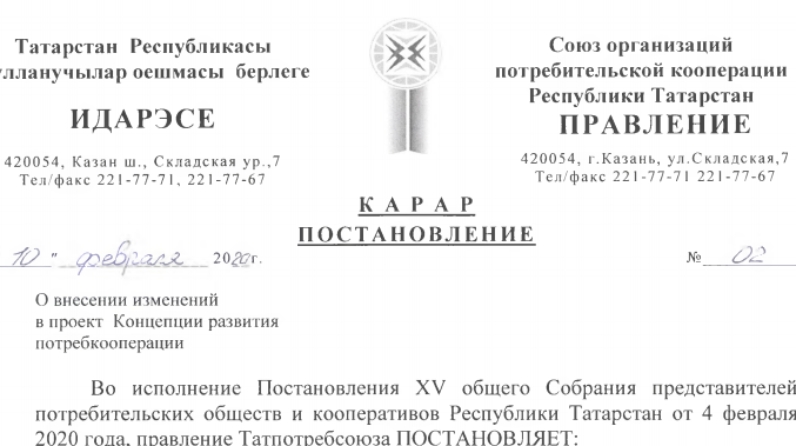 Постановлением XV общего Собрания представителей потребительских обществ и кооперативов Республики Татарстан от 4 февраля 2020 года райпо, ПО, ПК и правлению Татпотребсоюза поручено:
