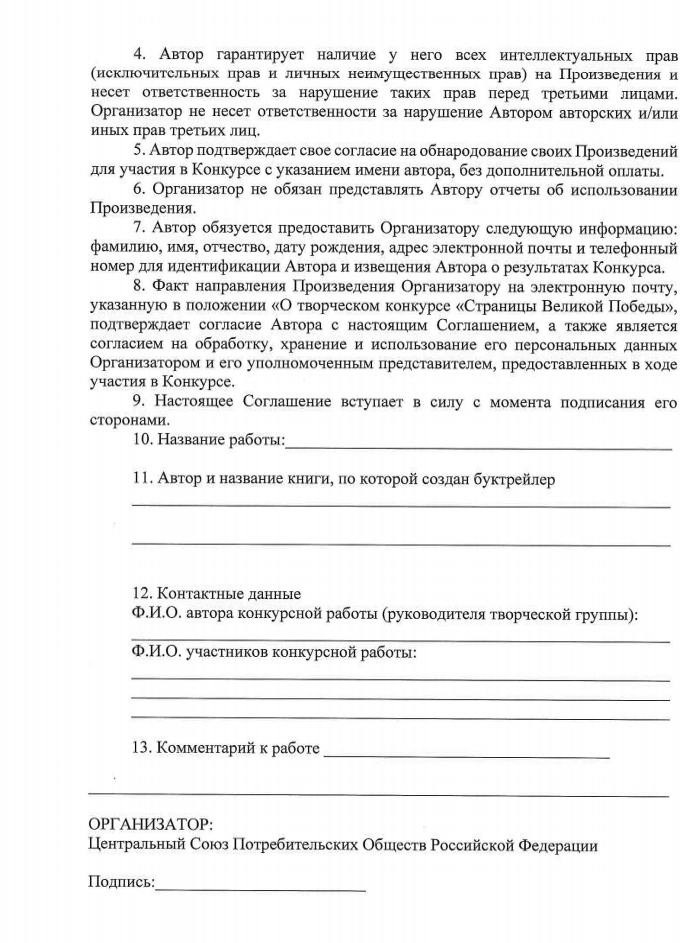 11. Буктрейлеры и анкета-заявка для участия в конкурсе в установленные сроки направляются в Центр информации и коммуникаций по адресу press@rus.coop с пометкой в теме письма: «Конкурс «Страницы Победы».