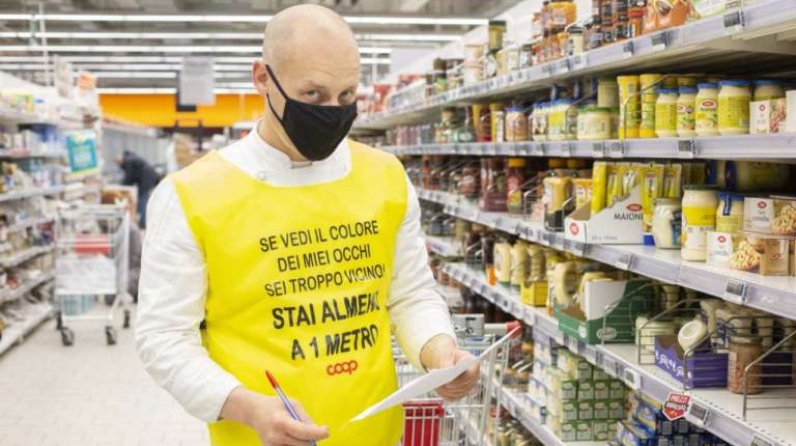 А сотрудники кооперативных магазинов Ломбардии, одного из наиболее пострадавших регионов Италии, одевают на работе специальные жилеты, напоминающие покупателям о технике безопасности в условиях пандемии и необходимости соблюдения дистанции.