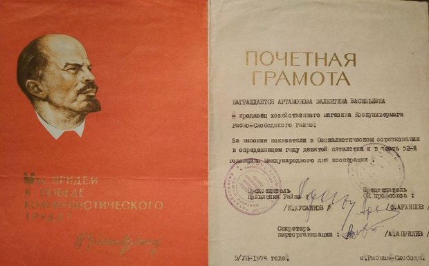 Почетная грамота продавщице Рыбно-Слободского райпо Валентине Артамоновой, 1974 год