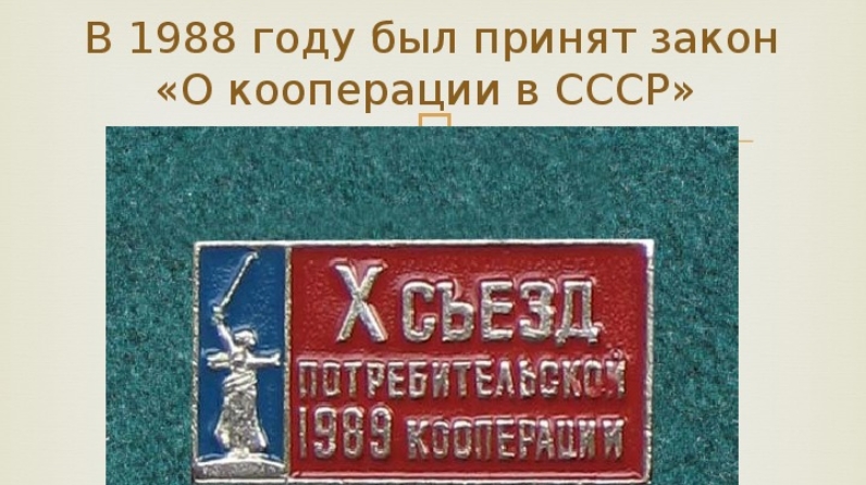 Новые веяния в Татпотребкооперации, о чём свидетельствует собрание совета в октябре 1987 г., соответствовали общему направлению в общественной жизни страны. Новый Закон «О кооперации в СССР», вступивший в силу с 1.07.1988 г., пожалуй, впервые за все годы был основан на изначальных кооперативных принципах. Закон провозглашал равноправие кооперативной и государственной собственности. Было подчёркнуто, что наряду с государственными предприятиями кооперация является основным звеном единого народнохозяйственного комплекса и участвует в формировании государственного бюджета. При этом особо отмечалось право кооперации на самостоятельное хозяйствование. В ст.45 Закона были сформулированы основные задачи потребкооперации: создание и развитие в сёлах и городах сети предприятий розничной торговли и общепита, обеспечение наряду с государственными торговыми предприятиями необходимыми товарами членов-пайщиков и обслуживание всего населения товарами как собственного производства, так и закупаемыми у организаций граждан.