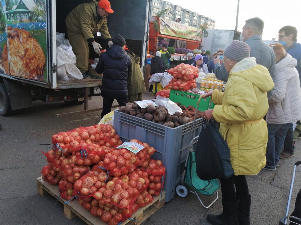 Пик покупательской активности на сельскохозяйственных ярмарках обычно приходится на 6-7 утра. Но даже в 10-ом часу людей у прилавков меньше не становится.