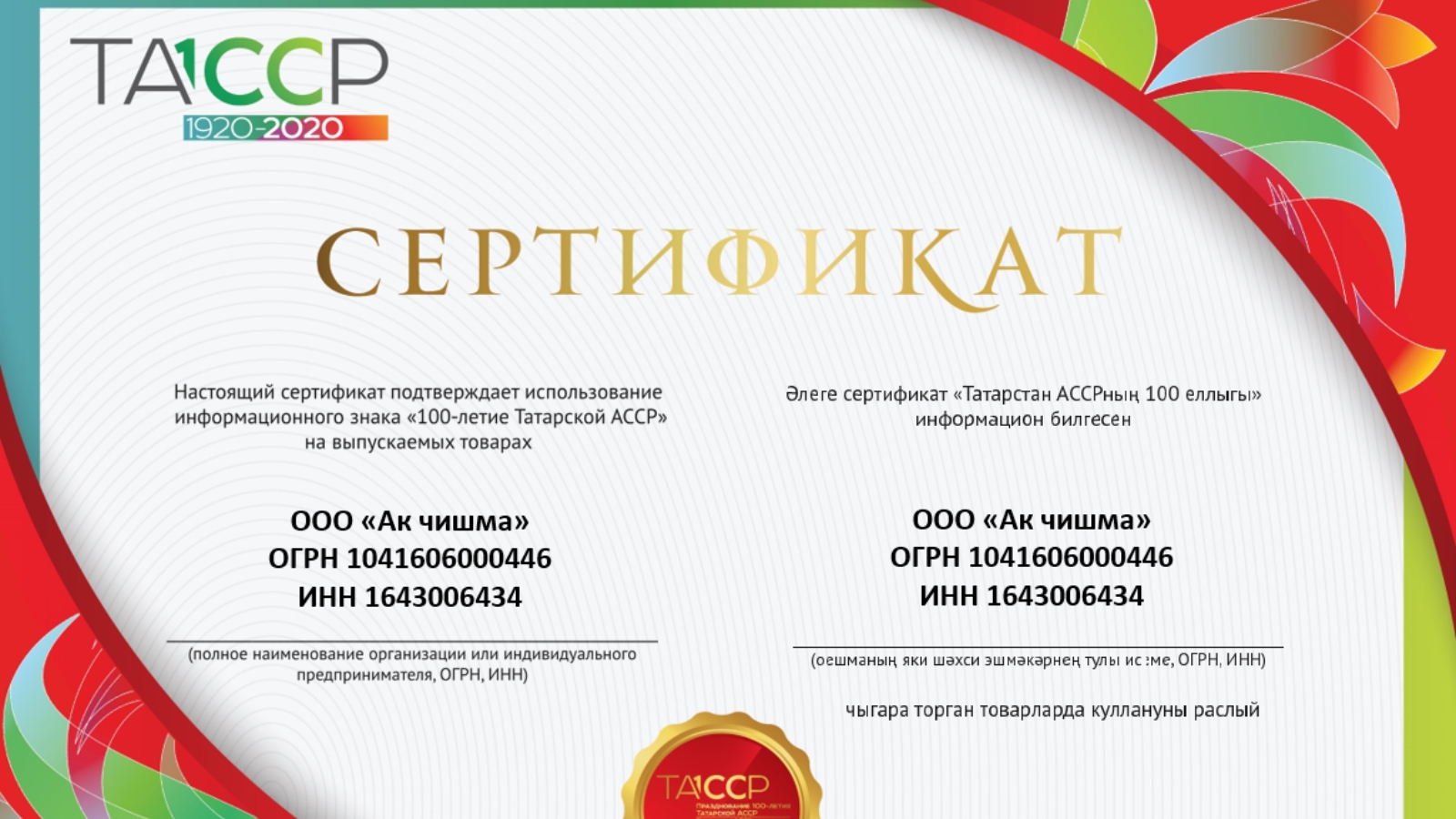 Предприятие общественного питания потребительской кооперации Республики Татарстан «Ак чишма» Азнакаевского района стало обладателем сертификата, подтверждающего использование информационного знака «100-летие Татарской АССР» на выпускаемых товарах.