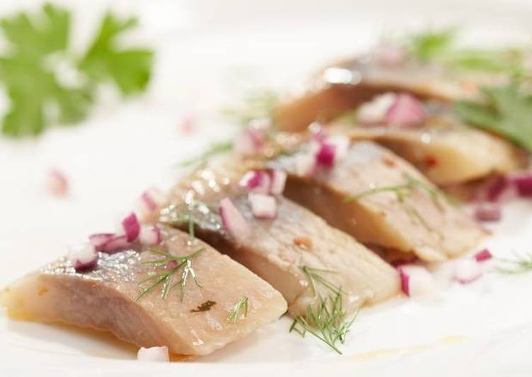 Сельдь потрошат, промывают в проточной воде, вымачивают в крепком чае, холодном молоке или воде от 30-40 минут до 1 часа (если она очень соленая). Затем с рыбы снимают кожу, после ее пластуют, убирают позвоночную и реберные кости, нарезают кусками шириной в 2 см, выкладывают в емкость и добавляют уксус, черный молотый перец, лавровый лист, мелко нашинкованный репчатый лук, растительное масло, перемешивают, добавляют горчицу и еще раз перемешивают, затем ставят на холод на 1 час. Приготовленную таким образом сельдь укладывают горкой в мелкую тарелку. Отдельно к сельди подают холодный отварной картофель.