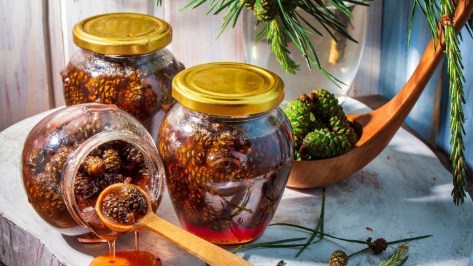 Борынгы заманнардан ук, мондый варенье төрле авыруларны дәвалау өчен киң кулланылган, ә аның гадәти булмаган тәме һәм хуш исе бу шифалы продуктка популярлык өстәгән генә. Нарат ул - фитонцид үсемлек булган мәңге яшел агач. Фитонцидлар - бактерияләр һәм гөмбәләрнең үсүен тәэмин итүче биологик актив матдәләр, һәм алар нарат күркәләрендә күп санлы. Әлбәттә, варенье өчен иске, күгәрек, карт күркәләр алу ярамый. Моның өчен озынлыгы 4 см дан артмаган яшь күркәләр алу мәслихәт. Нарат күркәсеннән кайнатма, барыннан да элек, сулыш органнары авыруларын, бронхитлар, плевритлар, пневмония, бронхиаль астма, туберкулез, шулай ук грипп һәм салкын тиюне дәвалау өчен кулланыла. Тәүлегенә ике аш кашыгы варенье кабул итү - дәвалауны тәэмин итәчәк.
