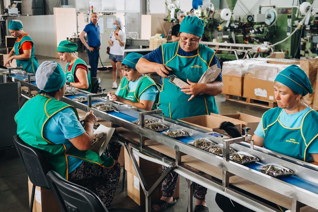 Во втором цехе разместили фасовочные линии для разных типов упаковки. В оборудование засыпают купажированный чай, а на выходе получают расфасованный в двухкамерные пакеты, пирамидки или полиэтиленовые блоки. На линии сидят восемь упаковщиц, которые собирают коробки и раскладывают в них отсортированный товар. В периоды крупных отгрузок производство работает круглые сутки без выходных посменно.