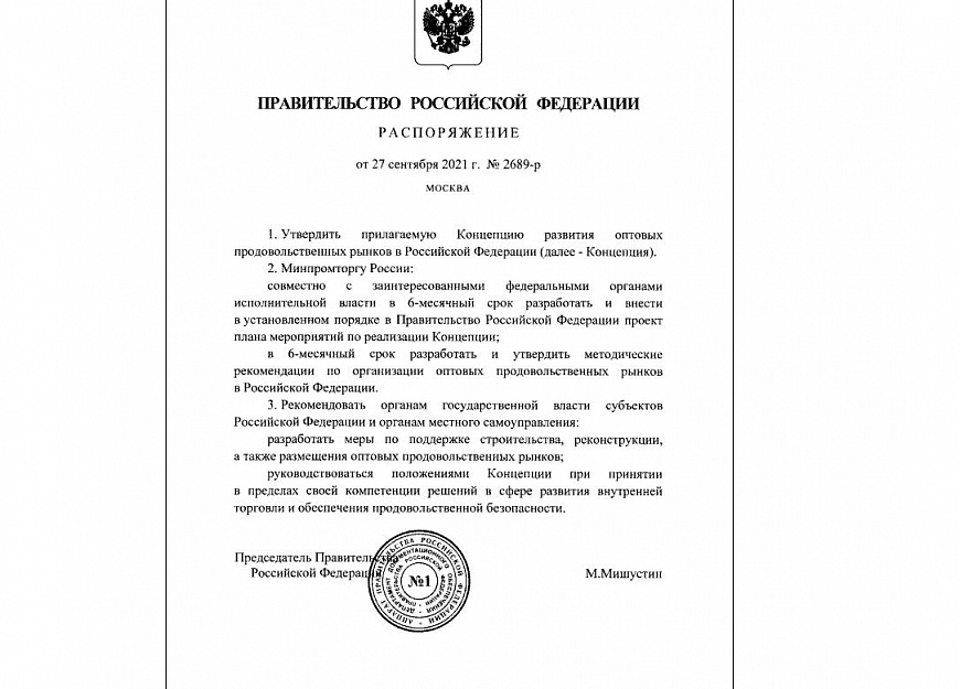 В России начнётся формирование целостной системы оптовых продовольственных рынков, объединяющих в себе весь спектр услуг по приёмке, фасовке и реализации продукции. Концепцию развития этого звена торговли своим распоряжением утвердил Председатель Правительства Михаил Мишустин (Распоряжение Правительства Российской Федерации № 2689-р от 27 сентября 2021 г.).