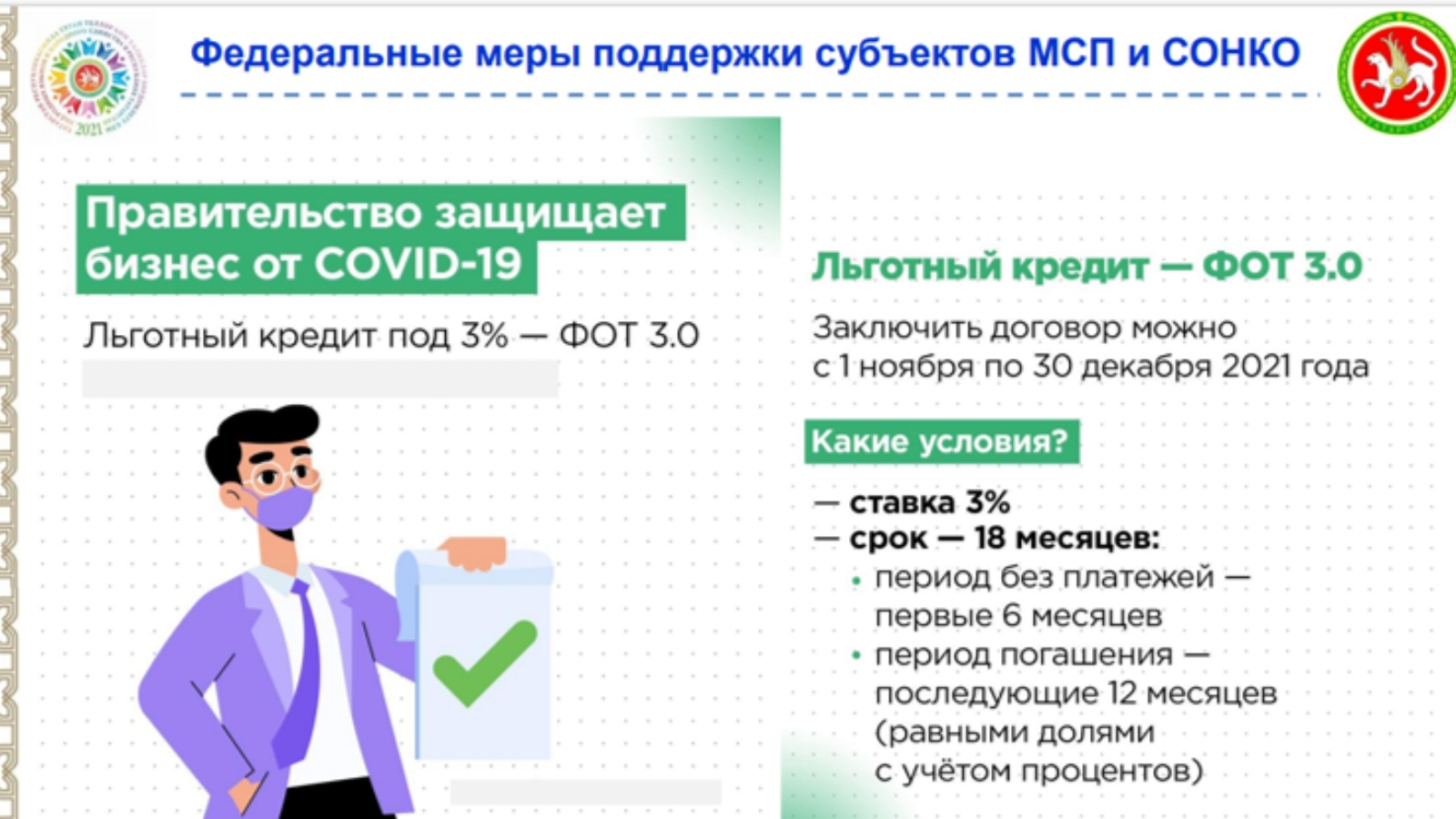 Рустем Сибгатуллин отметил, что, в соответствии с рекомендациями Центрального Банка РФ в адрес кредитных и микрофинансовых организаций, в целях оказания финансовой поддержки субъектам МСП, а также самозанятым гражданам рекомендовано проводить реструктуризацию ранее выданных кредитов и микрозаймов, включая ранее реструктуризированную задолженность и не начислять заемщикам неустойку, штрафы, пени. Прием заявок на реструктуризацию начат с 1 октября и продлится в срок до 31 декабря 2021 года. Подробнее с программами и их условиями можно ознакомиться в презентации.