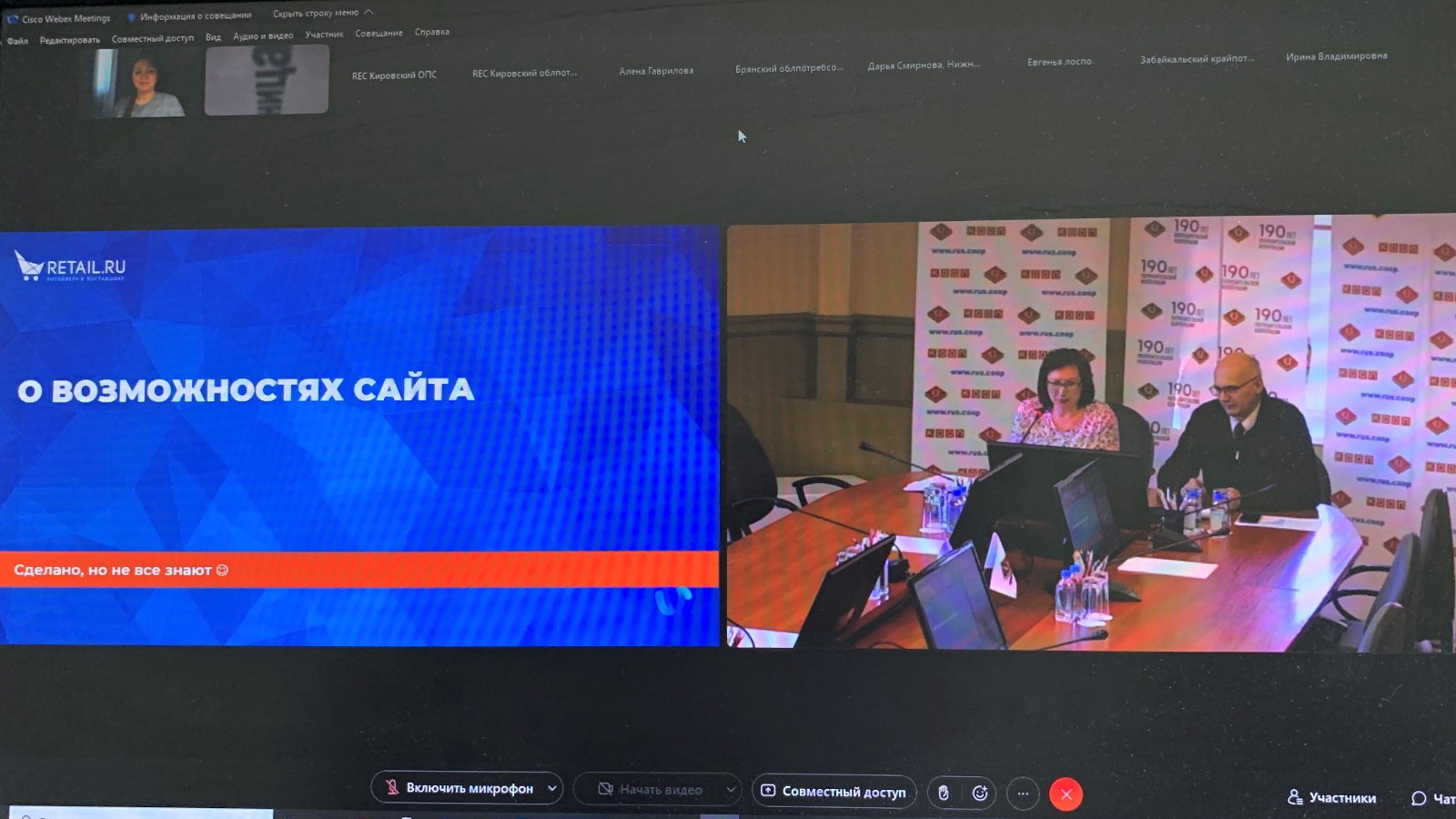 Об итогах работы региональных союзов потребительской кооперации в феврале и планах на текущий месяц выступила директор Центра информации и коммуникаций Центросоюза России Галина Лашманова. Были отмечены топ-10 сайтов региональных союзов потребительских обществ за отчетный период. В числе лучших показателей отмечен Союз организаций потребительской кооперации Республики Татарстан (Татпотребсоюз), который занял первое место в рейтинге с наибольшим количеством предоставленной информации на своем официальном сайте.