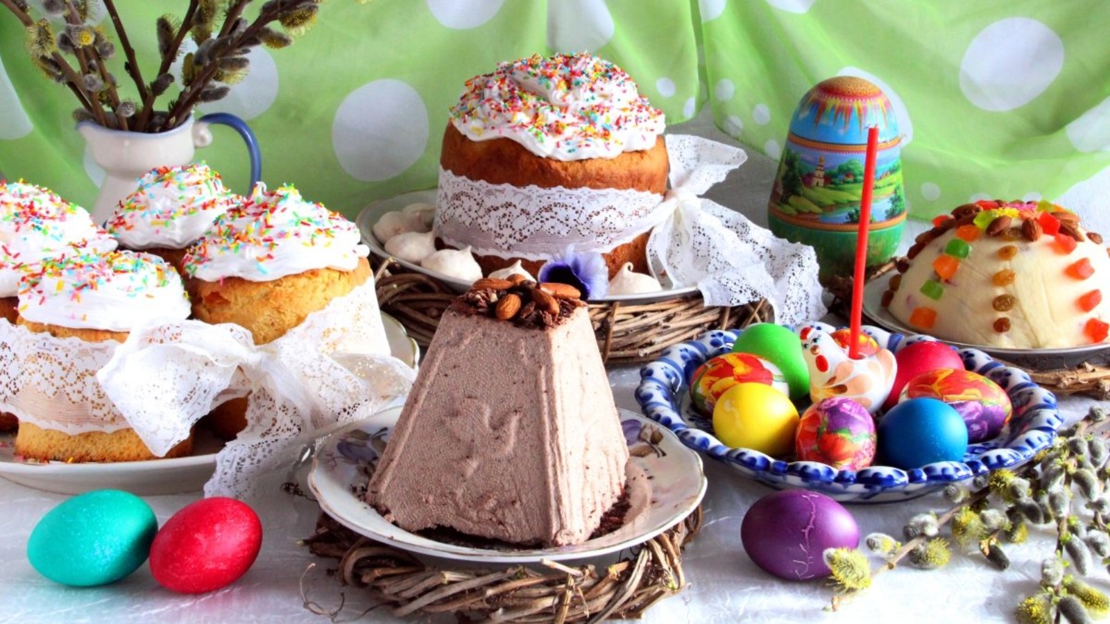 Традиционно к Пасхе накрывают особенно богатый праздничный стол, символами которого являются пасхальные яйца, кулич, творожная пасха и др. блюда.