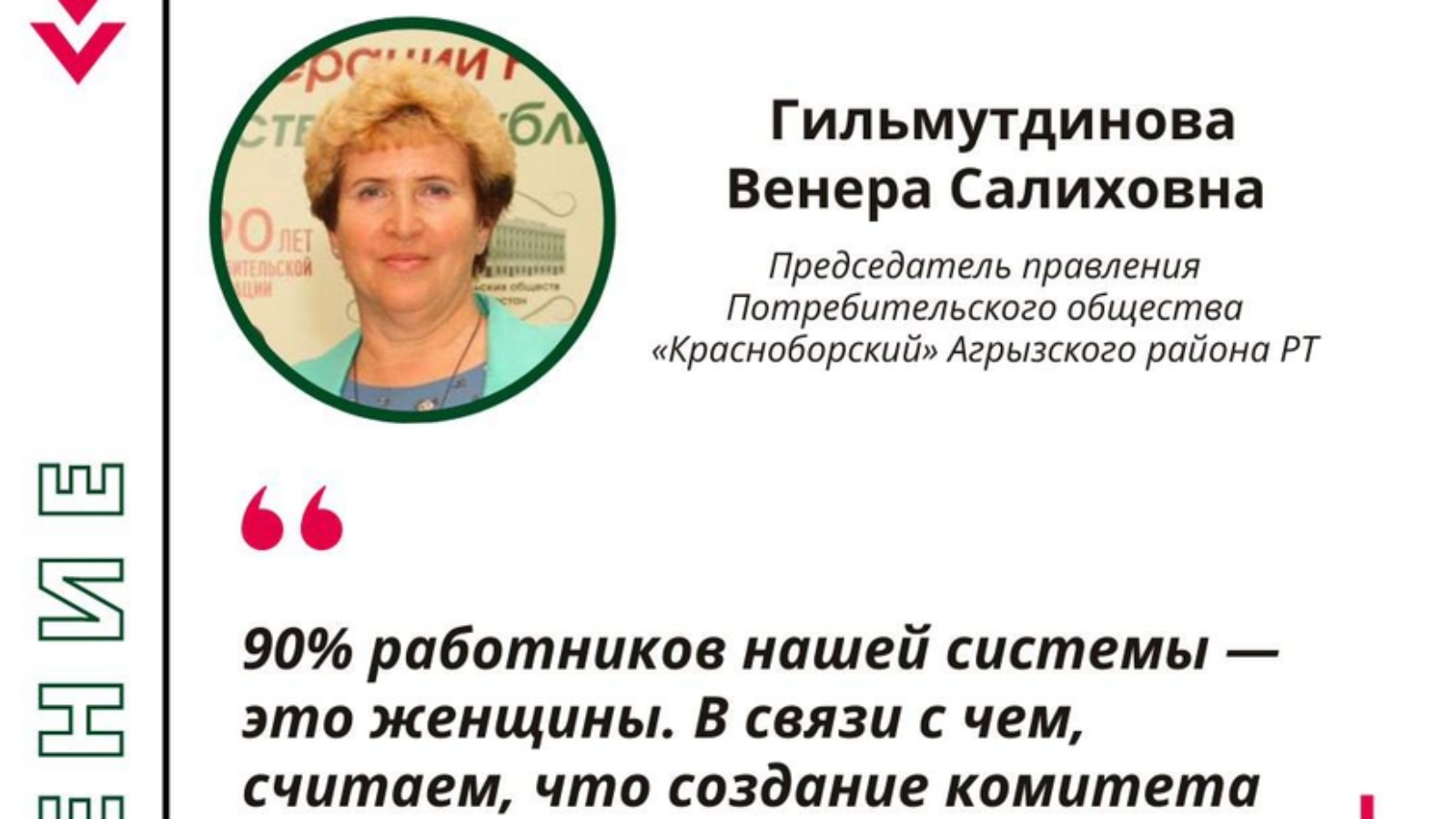 «Создание женского комитета по развитию кооперации — это новинка для нас. Хотелось бы обсуждать вопросы подготовки кадров потребкооперации для села, этот вопрос сегодня очень важен для нас. Вопросы реализации продукции собственного производства: хлебобулочных, кондитерских и прочих изделий. 90% работников нашей системы — это женщины. В связи с чем, считаем, что создание комитета необходимо и ускорит обмен предложениями и выработку своевременных решений во благо системы потребительской кооперации республики».