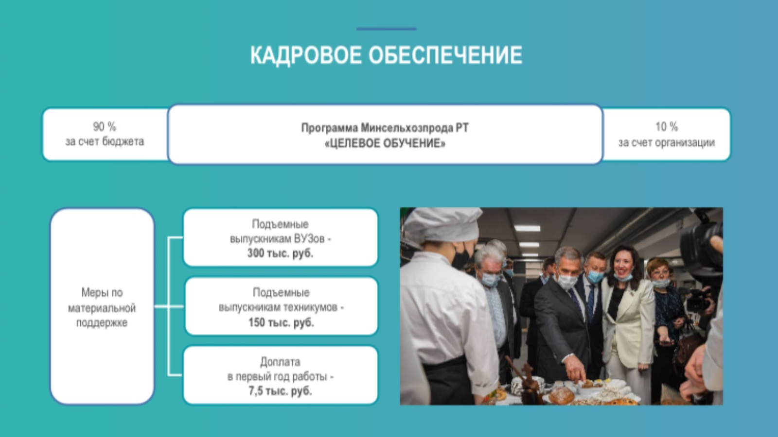 Постановлением Кабинета Министров Республики Татарстан определены условия предоставления субсидий на кадровое обеспечение. В соответствии с ним специалисты, окончившие высшие учебные заведения и заключившие трудовые договора с райпо на срок не менее 3 лет, получают единовременную выплату в размере 300 тысяч рублей; выпускники средних специальных учебных заведений - 150 тысяч рублей. Программа призвана решить проблему кадрового обеспечения организаций потребкооперации.