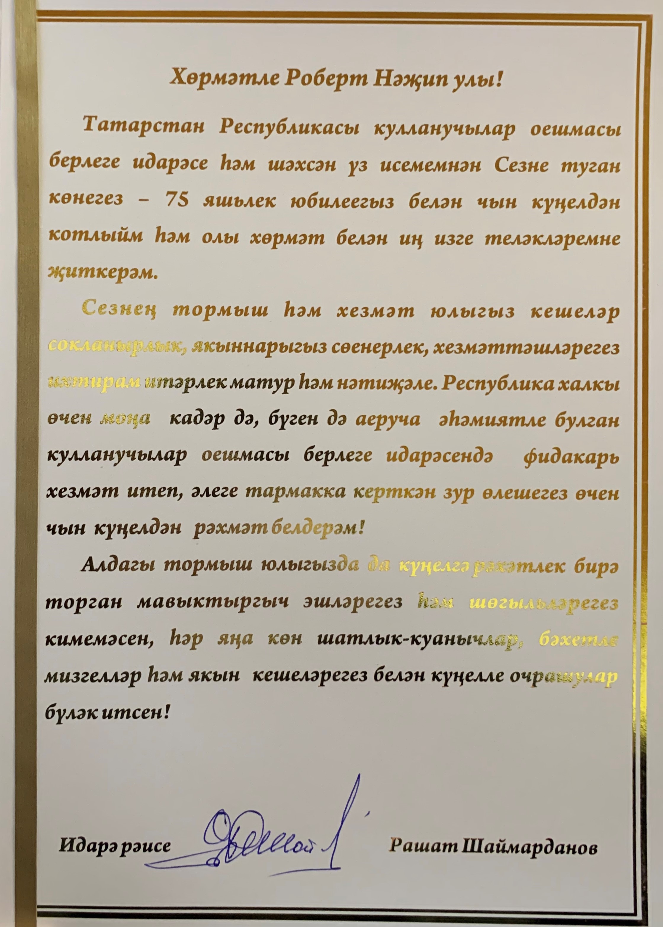 Правление Татпотребсоюза поздравляет Роберта Назиповича с днём рождения - 75-летним юбилеем. Желаем крепких сил и неугасаемой энергии, прочного здоровья и успехов в любом деле, уважения и понимания, благополучия в доме и счастья, искреннего добра, радости и достатка на жизненном пути!