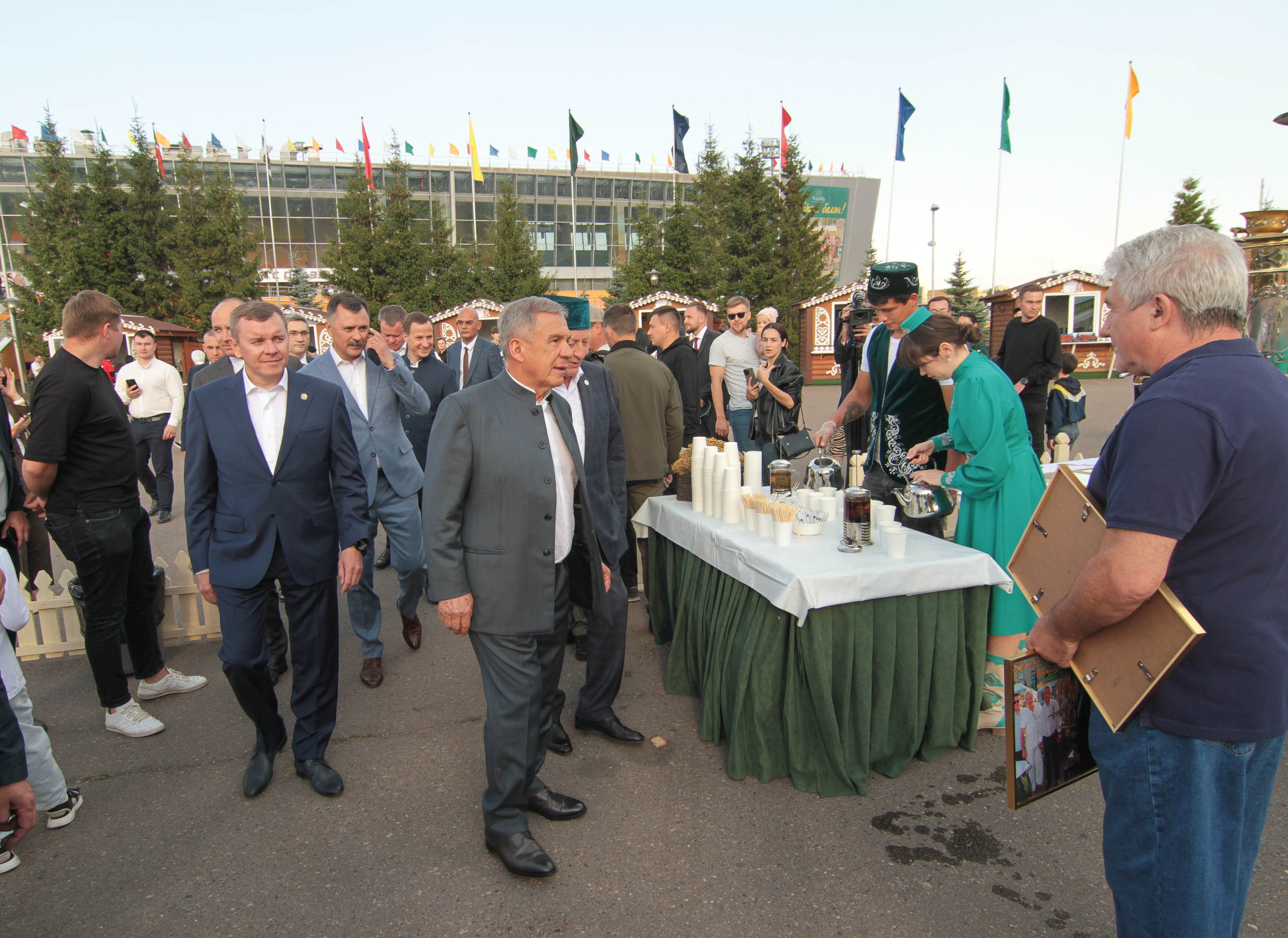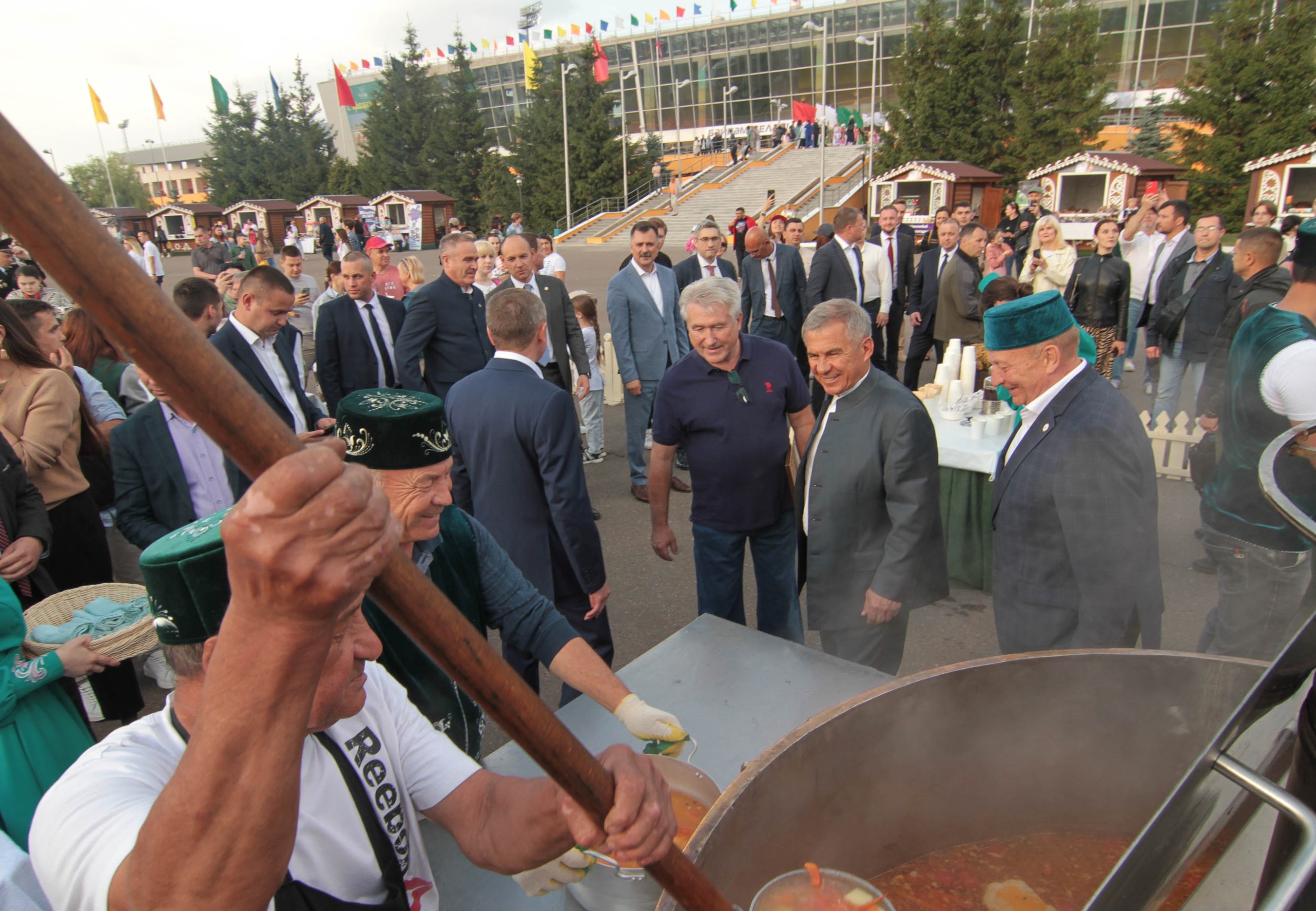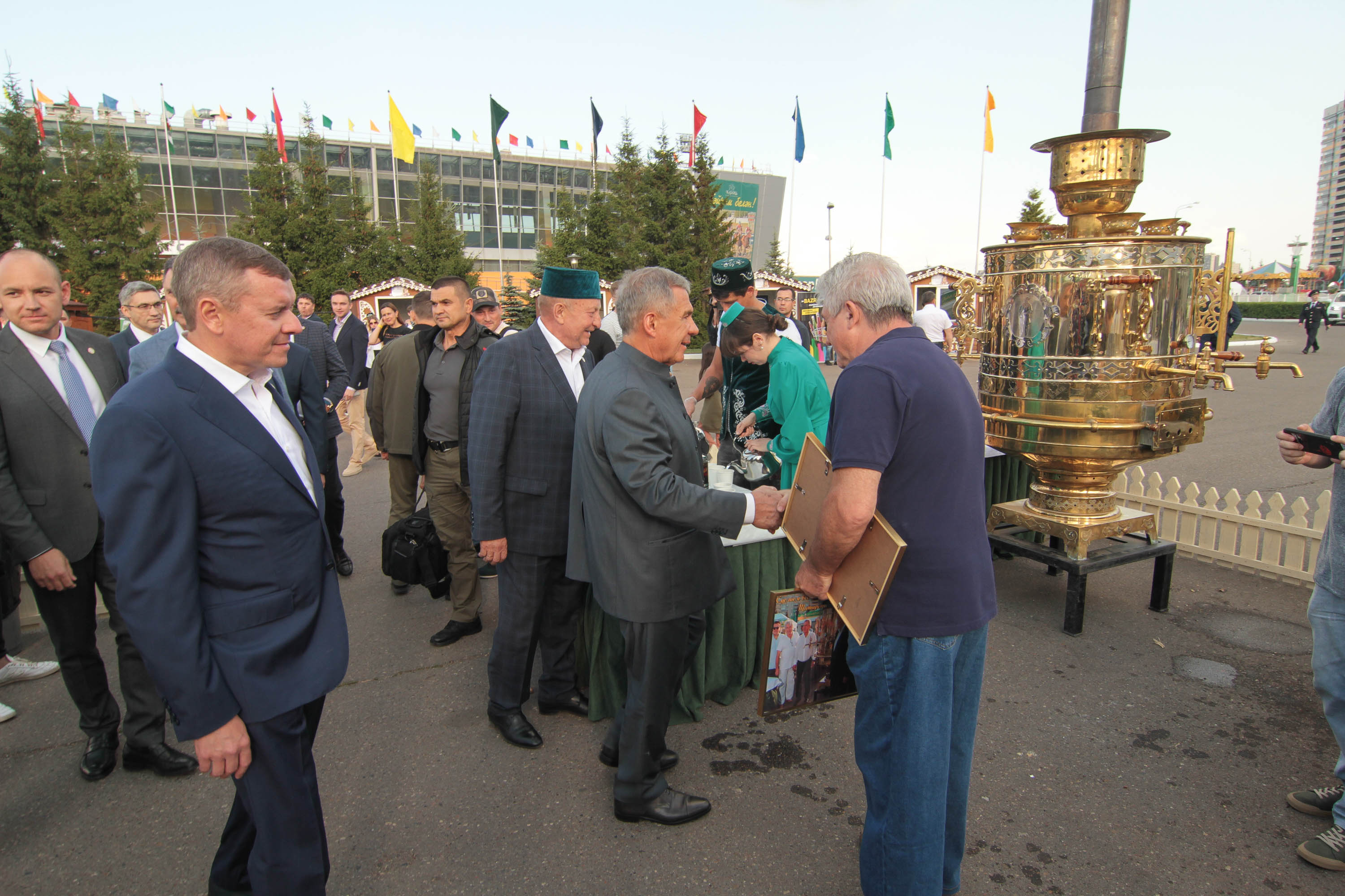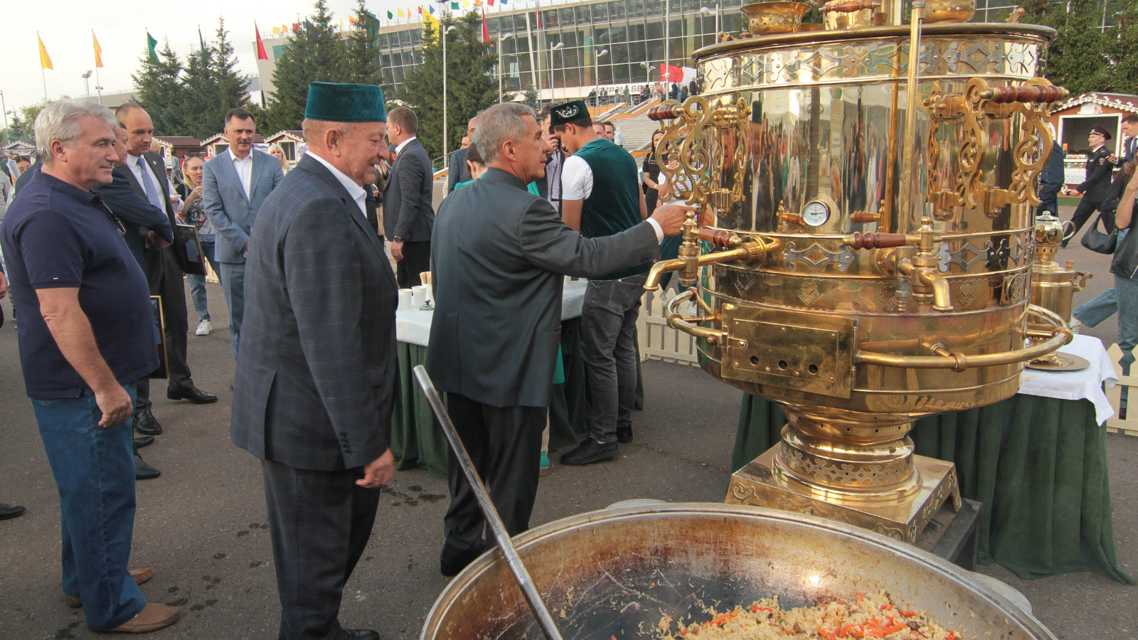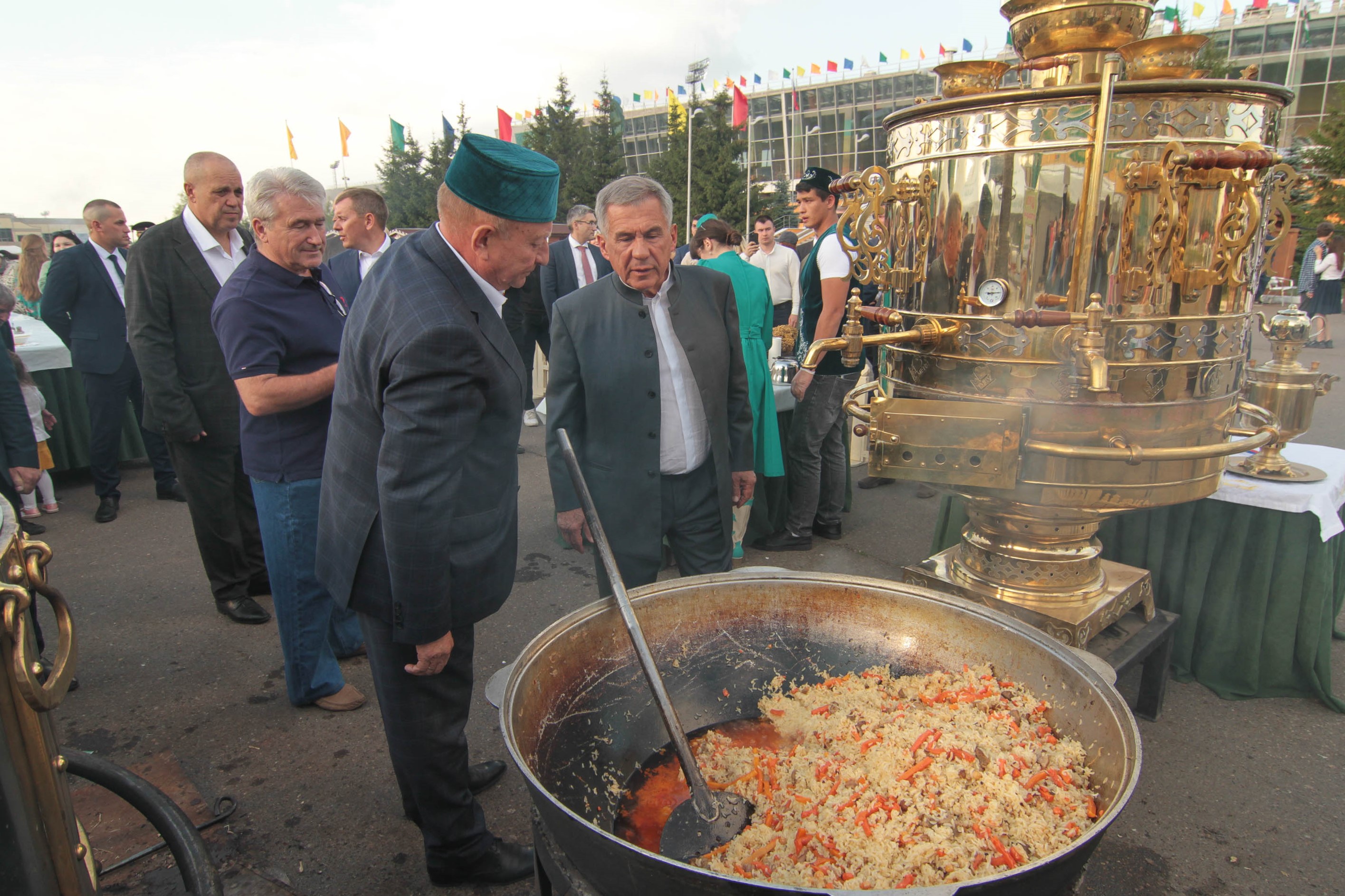 Раис Республики Татарстан Рустам Минниханов и другие представители также посетили экспозицию, организованную Татпотребсоюзом. На мероприятии для гостей Сабантуя были приготовлены традиционные блюда – плов и шурпа из баранины на «Татарском самоваре». Также было представлено чаепитие из самого высокого тульского самовара.