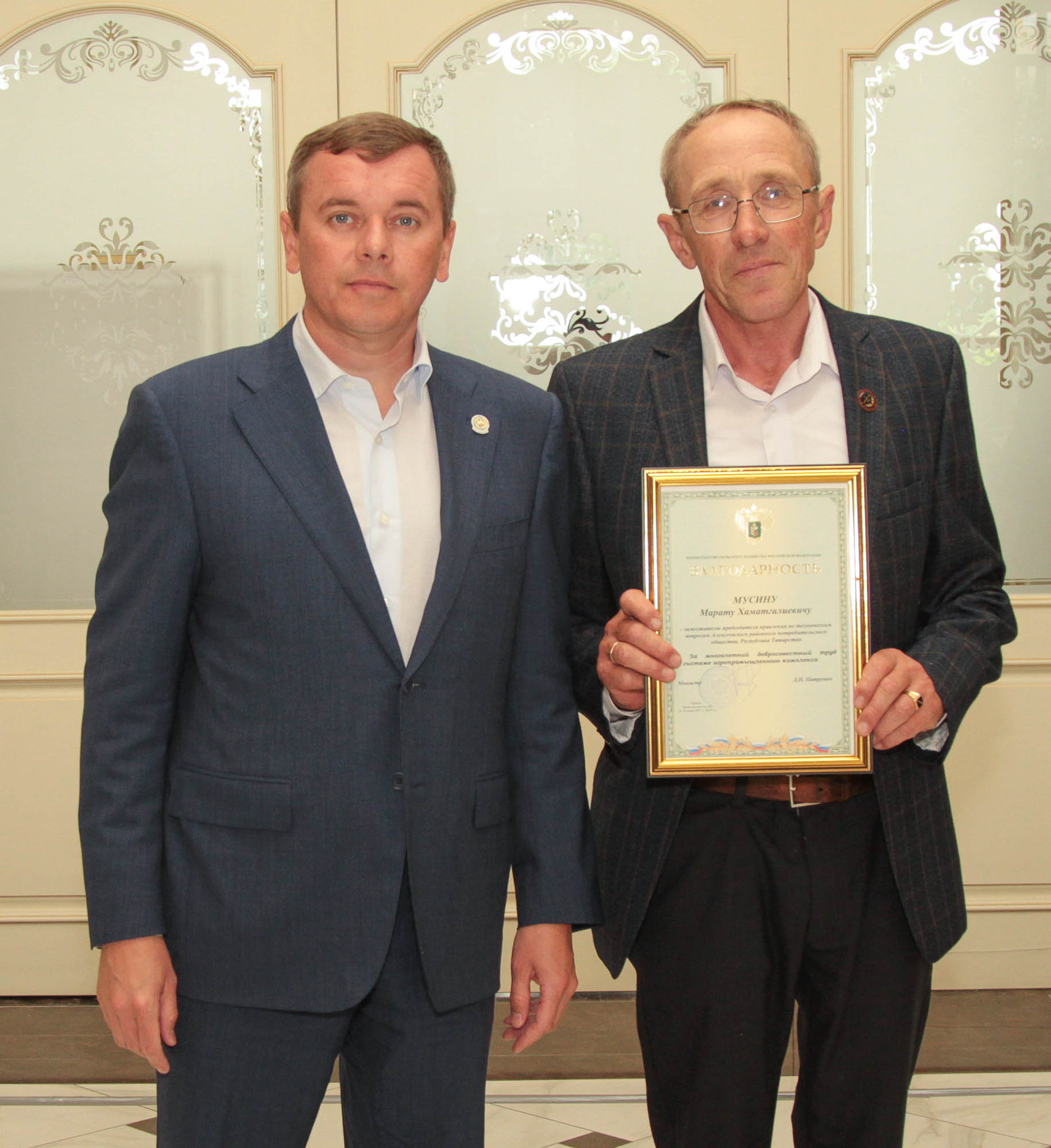 Заместителю председателя правления по техническим вопросам Алексеевского районного потребительского общества Мусину Марату Хаматгалиевичу.