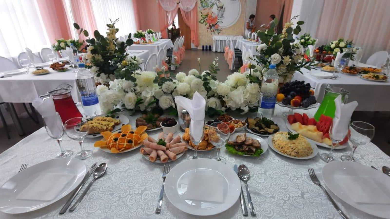 Белоснежные скатерти, украшенные вышивками, столовые приборы и хрустальные бокалы создавали благородную атмосферу. Цветочные композиции украшали каждый стол, придавая еще больше красоты и элегантности всему мероприятию. Весь персонал кафе "Дуслык" делал все возможное, чтобы создать незабываемую атмосферу для свадебного торжества.