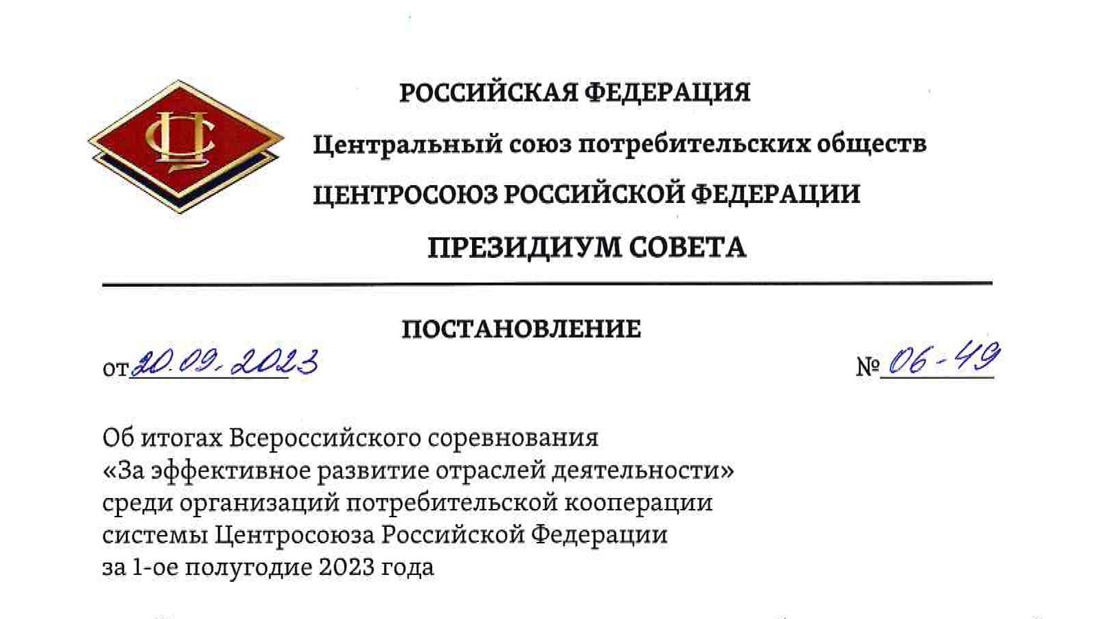 По итогам Всероссийского соревнования «За эффективное развитие отраслей деятельности среди организаций потребительской кооперации системы Центросоюза за первое полугодие 2023 года: