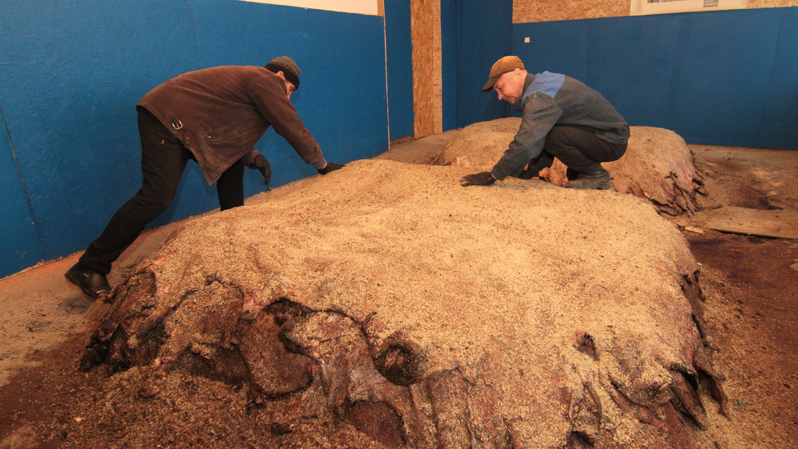 Мокросоление. При консервировании мокросолением на каждый килограмм шкуры расходуется 400 г соли. Засолка проводится на деревянном помосте (стеллаже) размером 200×250 см. Для лучшего стока рассола (тузлука) средняя часть помоста должна быть на 10-15 см выше боковых.