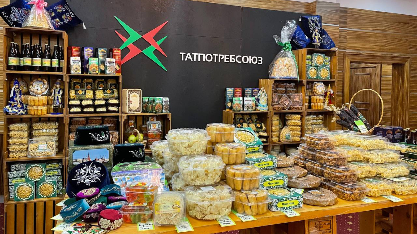 В связи с этим в КРК «Корстон» организовали выставку. В фойе выставочного комплекса также размещен стенд Татпотребсоюза, где представлена продукция собственного производства потребительских обществ и кооперативов.