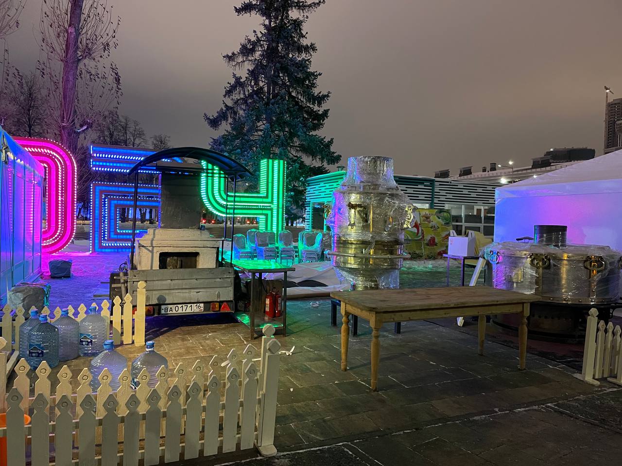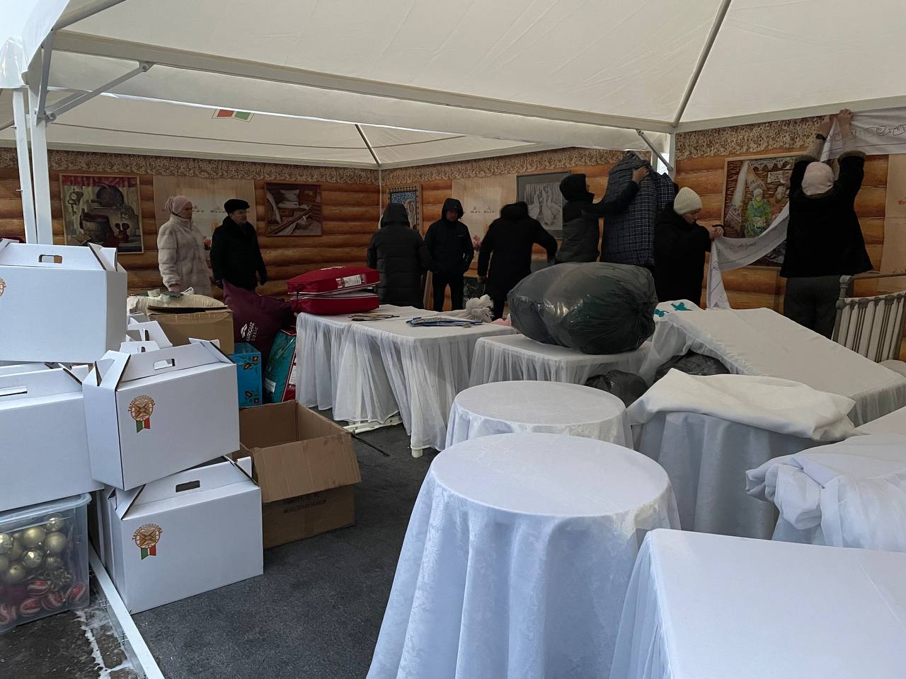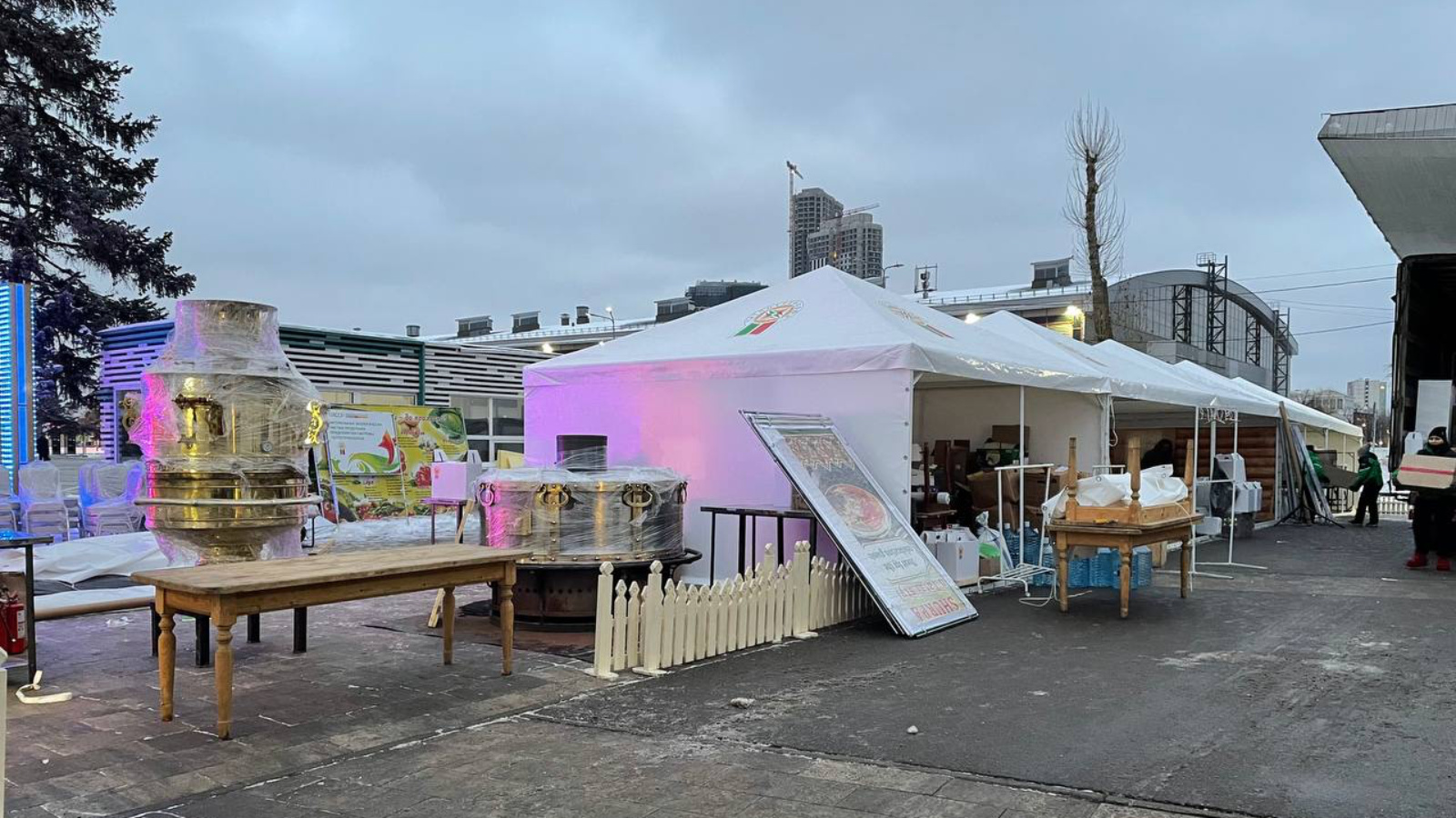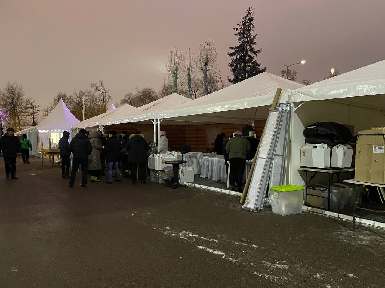 В данный момент ведутся подготовительные работы: монтаж палаток, выгрузка товаров и продукции.