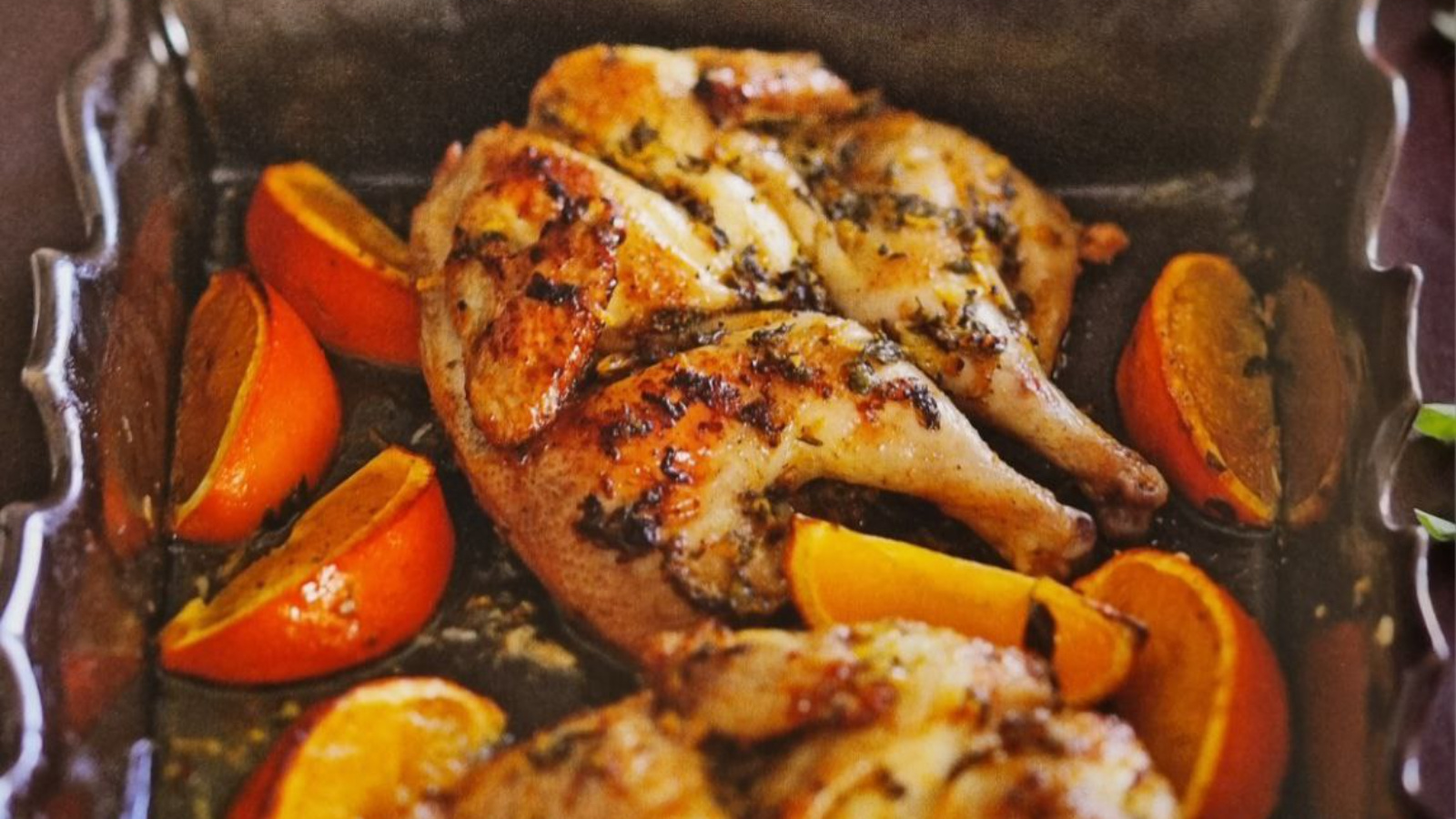 Готового цыпленка разрезают на порционные куски и подают с запеченными дольками апельсинов.