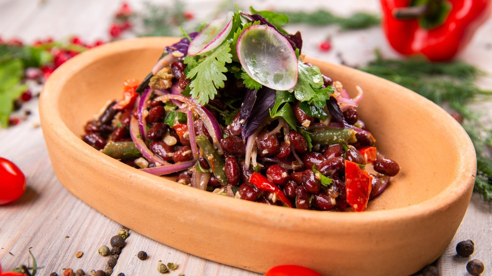 Отварное остывшее мясо, болгарский перец нарезают соломкой, добавляют фасоль, маринованный лук, подсушенные на сухой сковороде и рубленые грецкие орехи, мелко нарезанные кинзу, красный острый перец, чеснок. Все заливают заправкой для салата и тщательно перемешивают.