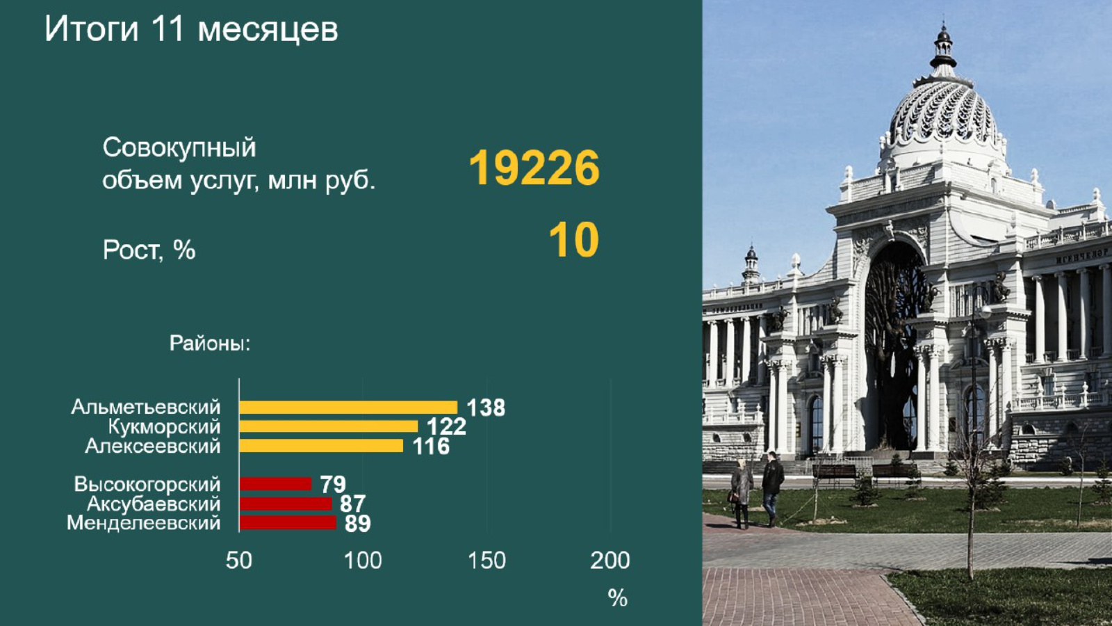 За одиннадцать месяцев текущего года организации потребительской кооперации Республики Татарстан оказали совокупный объем услуг на сумму 19,2 млрд рублей, с ростом на 10 % к уровню прошлого года. Наивысший объем услуг оказан кооператорами Альметьевского, Кукморского, Алексеевского районов. Ниже своих возможностей сработали кооператоры Высокогорского, Аксубаевского, Менделеевского районов.