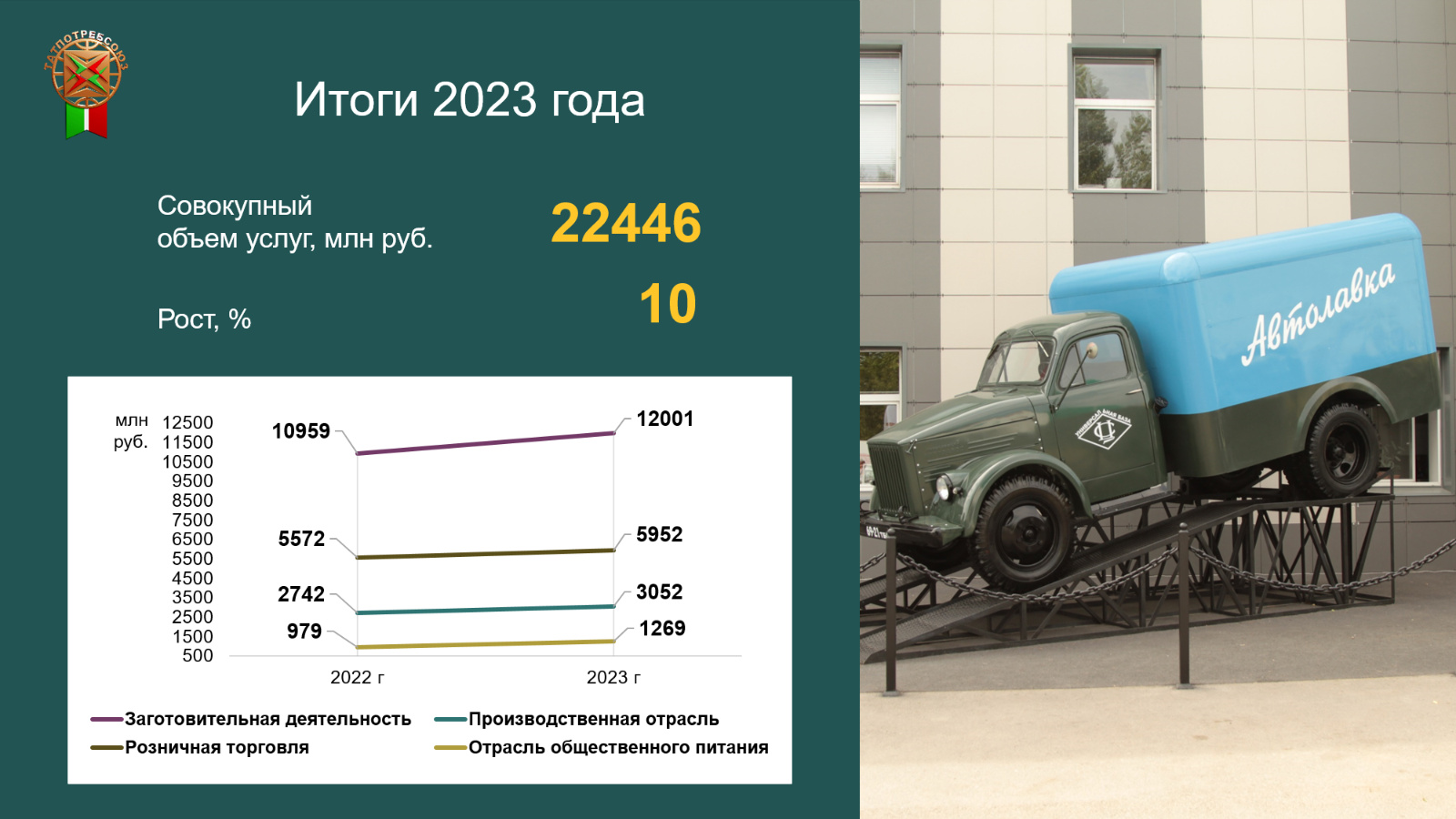 За 2023 год организации потребительской кооперации Республики Татарстан оказали совокупный объем услуг на сумму около 22,5 млрд рублей, с ростом на 10 % к уровню прошлого года.