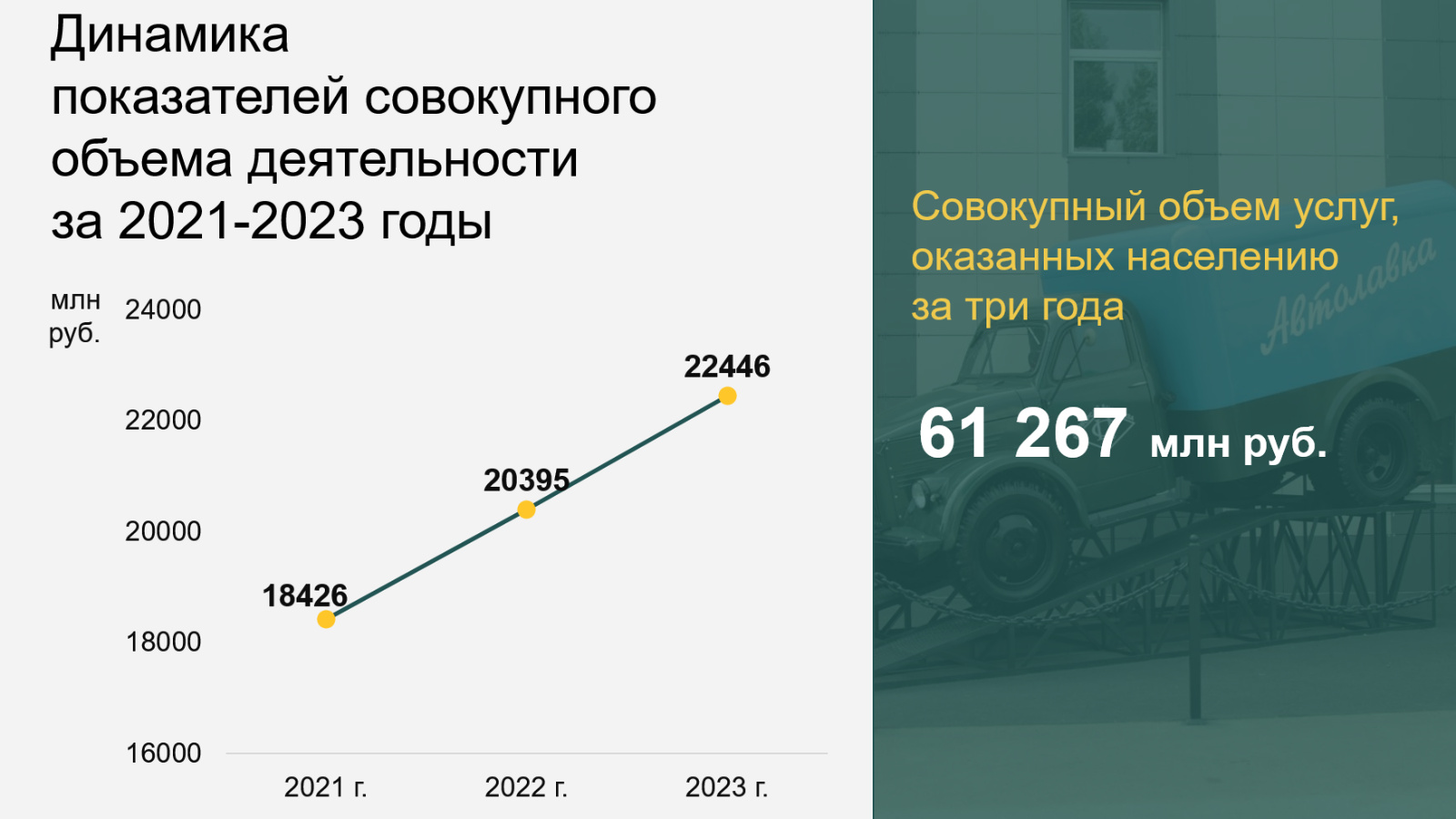 Розничный товарооборот за последние 3 года составил 16,8 млрд рублей. На сегодняшний день 135 автолавок обслуживают 1216 населенных пунктов мобильным форматом торговли. С 2021 года сданы в эксплуатацию 136 пунктов комплексного обслуживания населения.