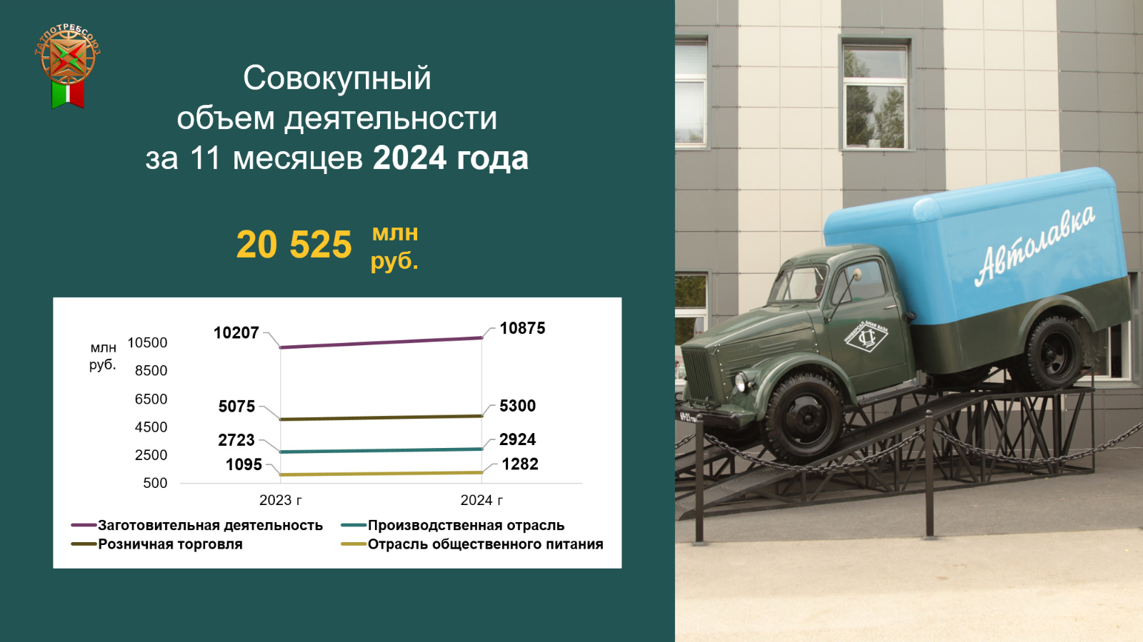 Совокупный объем деятельности оказываемых услуг организациями потребительской кооперации за 11 месяцев 2024 года составил более 20,5 млрд рублей, с ростом на 7% к уровню прошлого года.