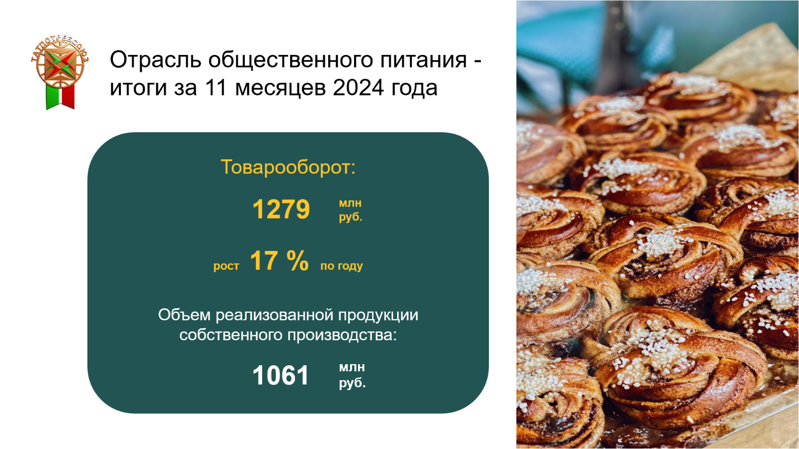 В отрасли общественного питания за одиннадцать месяцев обеспечен товарооборот в сумме 1279 млн рублей с ростом к уровню прошлого года на 17 %. Объем реализованной продукции собственного производства составил более 1061 млн рублей.