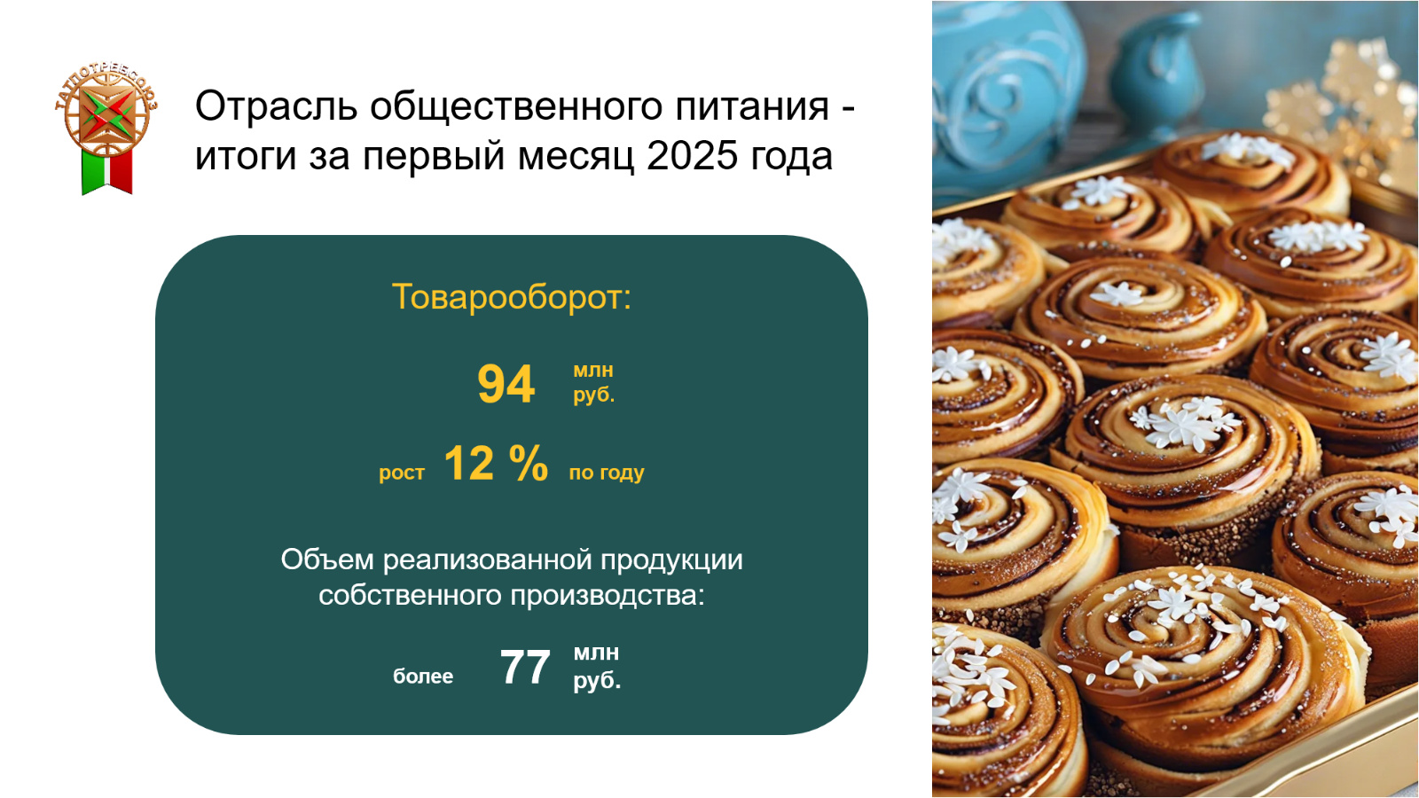 В отрасли общественного питания обеспечен товарооборот в сумме 94 млн рублей с ростом к уровню прошлого года на 12 %. Объем реализованной продукции собственного производства составил более 77 млн рублей (рост 9%).