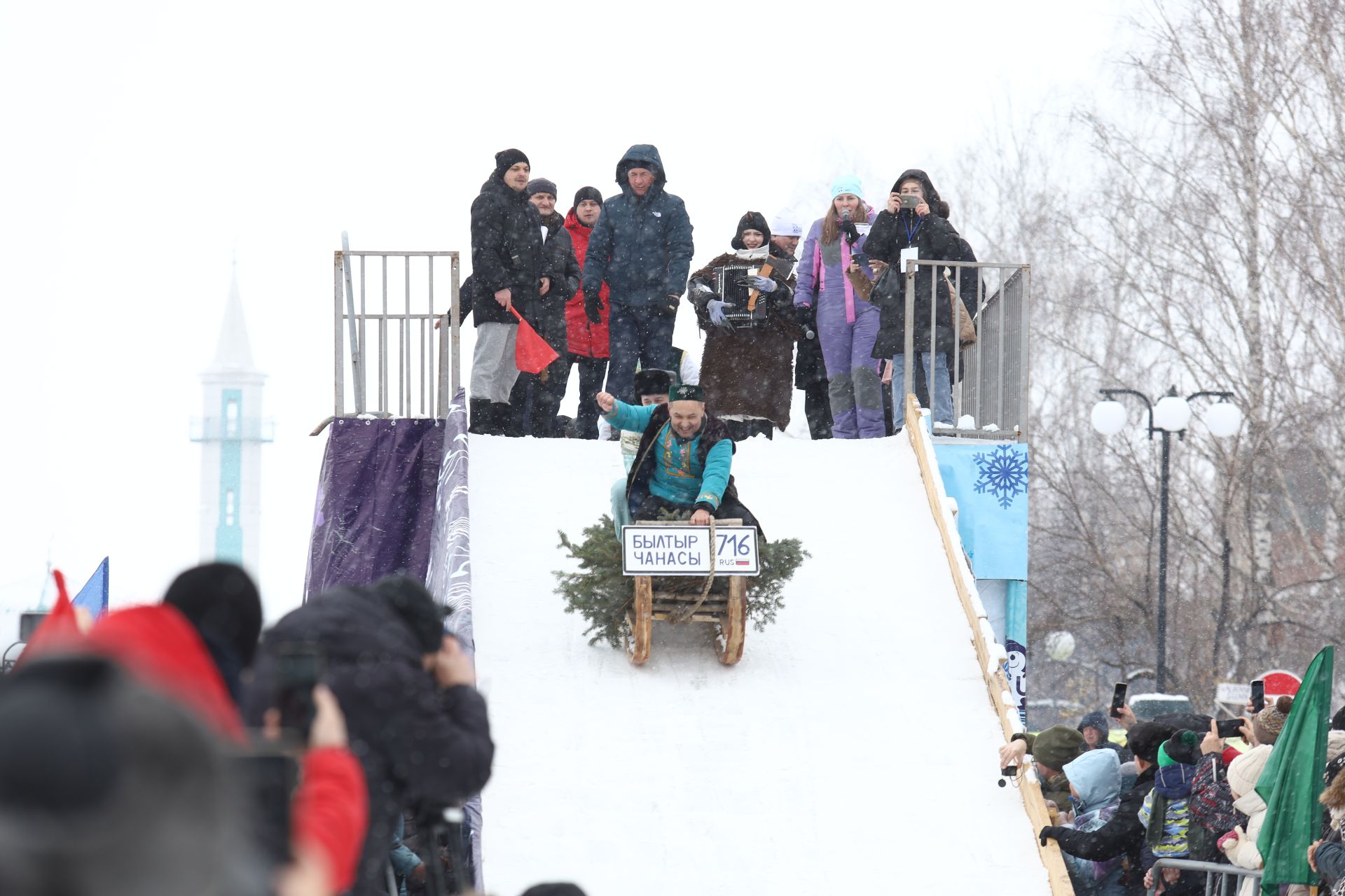 Вместо обычных ледянок участники спускались с огромной горы на самых необычных конструкциях: в виде телевизоров, мельниц,автомобилей и даже Спасской башни Казанского кремля. Главное – прокатиться быстро, весело и, желательно, добраться до финиша, а не остановиться на полпути. В этом году «Sunny ФЕСТ» состоялся в девятый раз.Сани для участия приготовили 20 команд из разных уголков республики