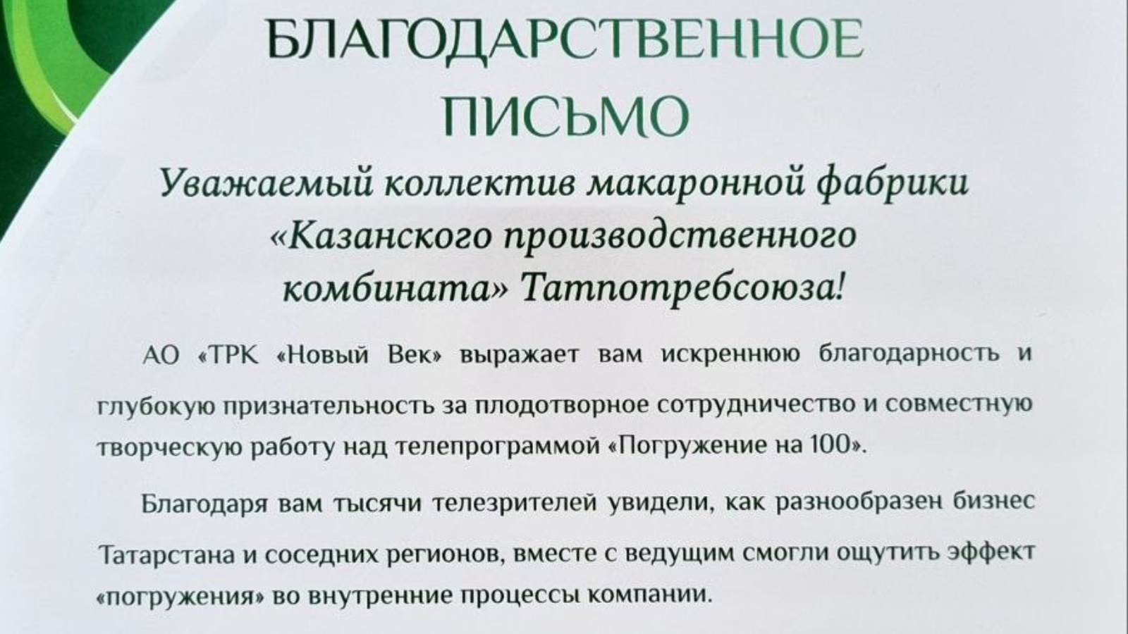 В благодарственном письме выражена признательность за плодотворное сотрудничество и совместную творческую работу над телепрограммой «Погружение на 100».