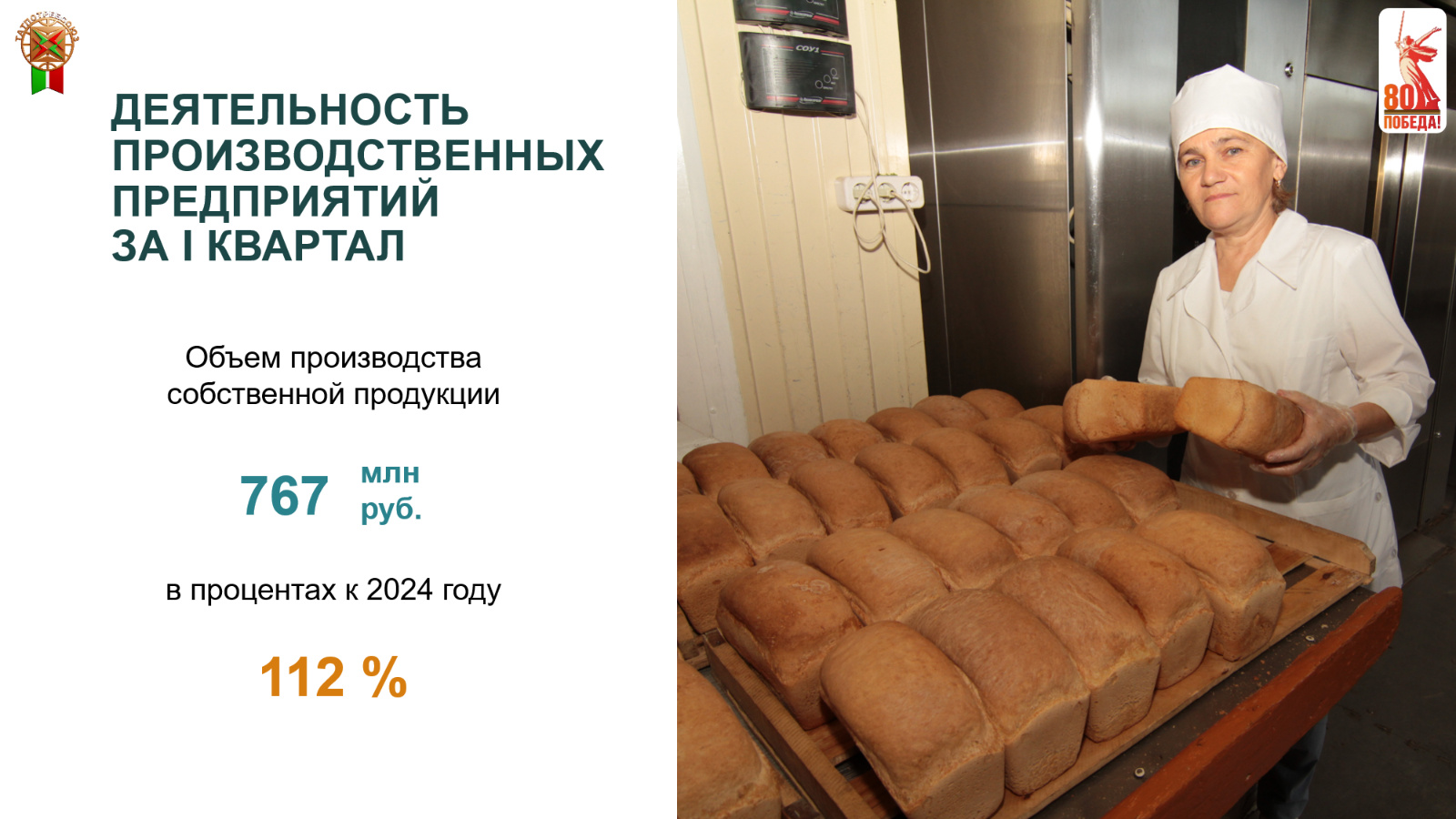 Производственные предприятия потребительской кооперации за I квартал текущего года обеспечили выпуск собственной продукции на сумму 767,3 млн рублей с ростом 12 % за отчетный период, в том числе хлебопечение в объеме 440,7 млн рублей с ростом 2 %. В ассортиментной линейке все виды изделий произведены с ростом к прошлому периоду.