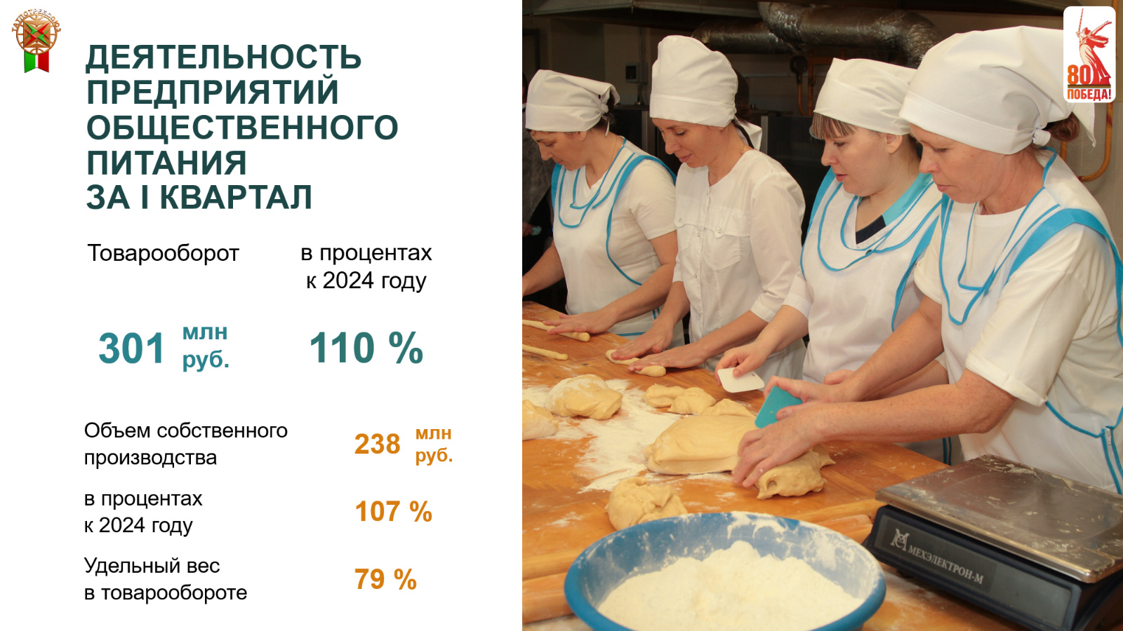 В отрасли общественного питания за I квартал текущего года обеспечен товарооборот в сумме 301 млн рублей с ростом к уровню прошлого года на 10 %. Объем реализованной продукции собственного производства составил более 238 млн рублей (рост 7 %).