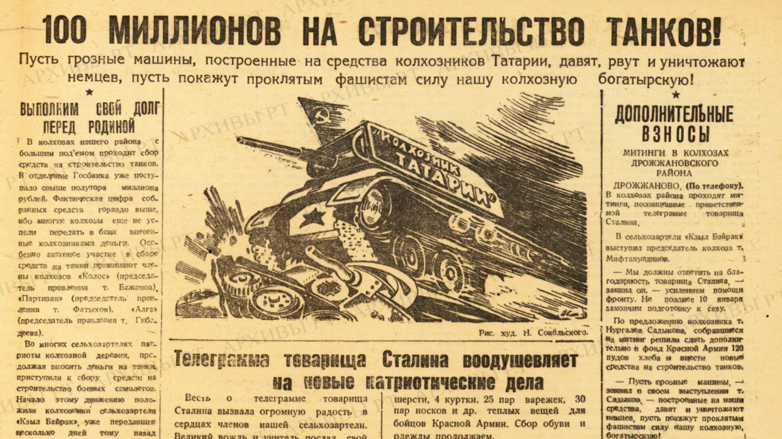 Помимо трудового вклада в дело победы над врагом, граждане страны стремились оказать и финансовую поддержку, организовав сбор средств на создание танков и самолетов. В Татарстане был выдвинут призыв: «Соберем 100 миллионов рублей на строительство танков!» Кооператоры также активно участвовали в этой кампании. В декабре 1941 года сотрудники Верхнеуслонского РПС собрали на строительство танков 900 тысяч рублей. Пайщики Верхнеуслонского района пожертвовали 200 тысяч рублей на создание танковых колонн и авиационных эскадрилий, а пайщики Атнинского района - 100 тысяч рублей. Всего системой Татсоюза за IV квартал 1941 года и I квартал 1943 года был собран и передан 1 миллион рублей. За годы войны система Татсоюза внесла в фонд обороны 83 миллиона рублей. Кроме того, пайщики сельпо пожертвовали 1,5 миллиона рублей на строительство эскадрилий самолетов и 390 тысяч рублей на танковую колонну.