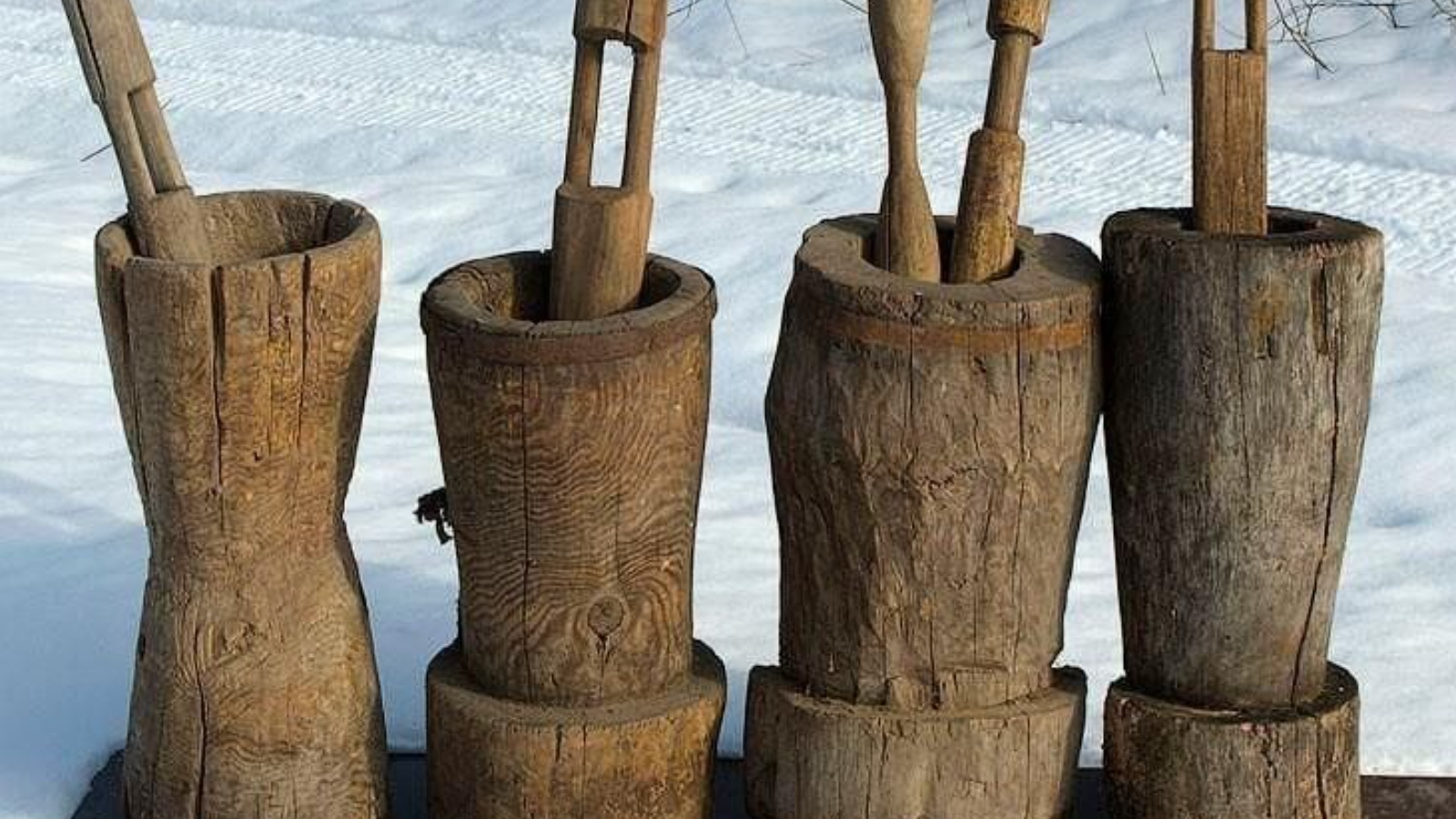 Ступа с пестом, которые использовались для измельчения круп в середине 20 века. Этот предмет, выполненный из дерева, является не только интересным примером традиционного быта, но и свидетельством функциональности и простоты, характерной для того времени.