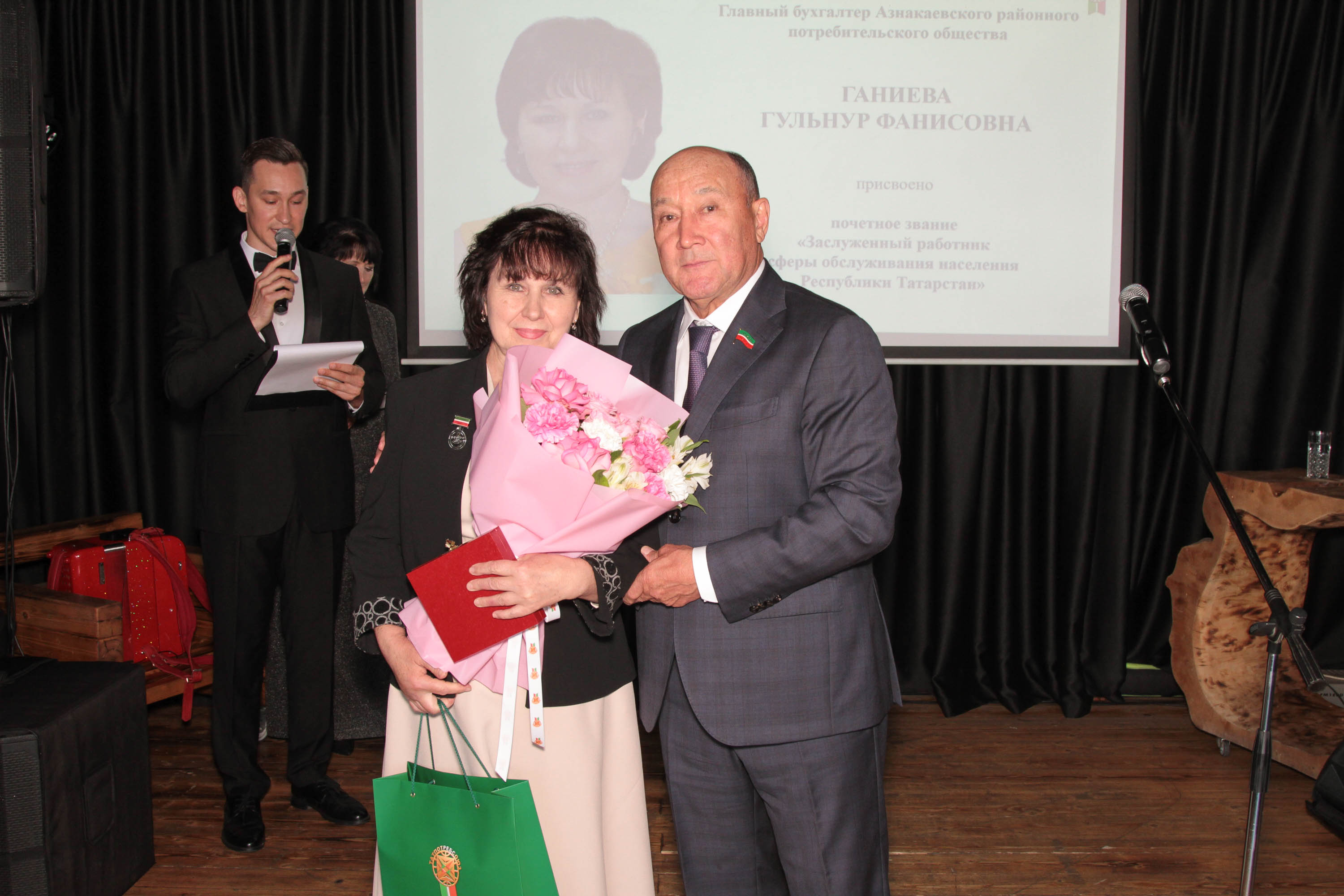 Главному бухгалтеру Азнакаевского районного потребительского общества ГАНИЕВОЙ ГУЛЬНУР ФАНИСОВНЕ присвоено почетное звание «Заслуженный работник сферы обслуживания населения Республики Татарстан»