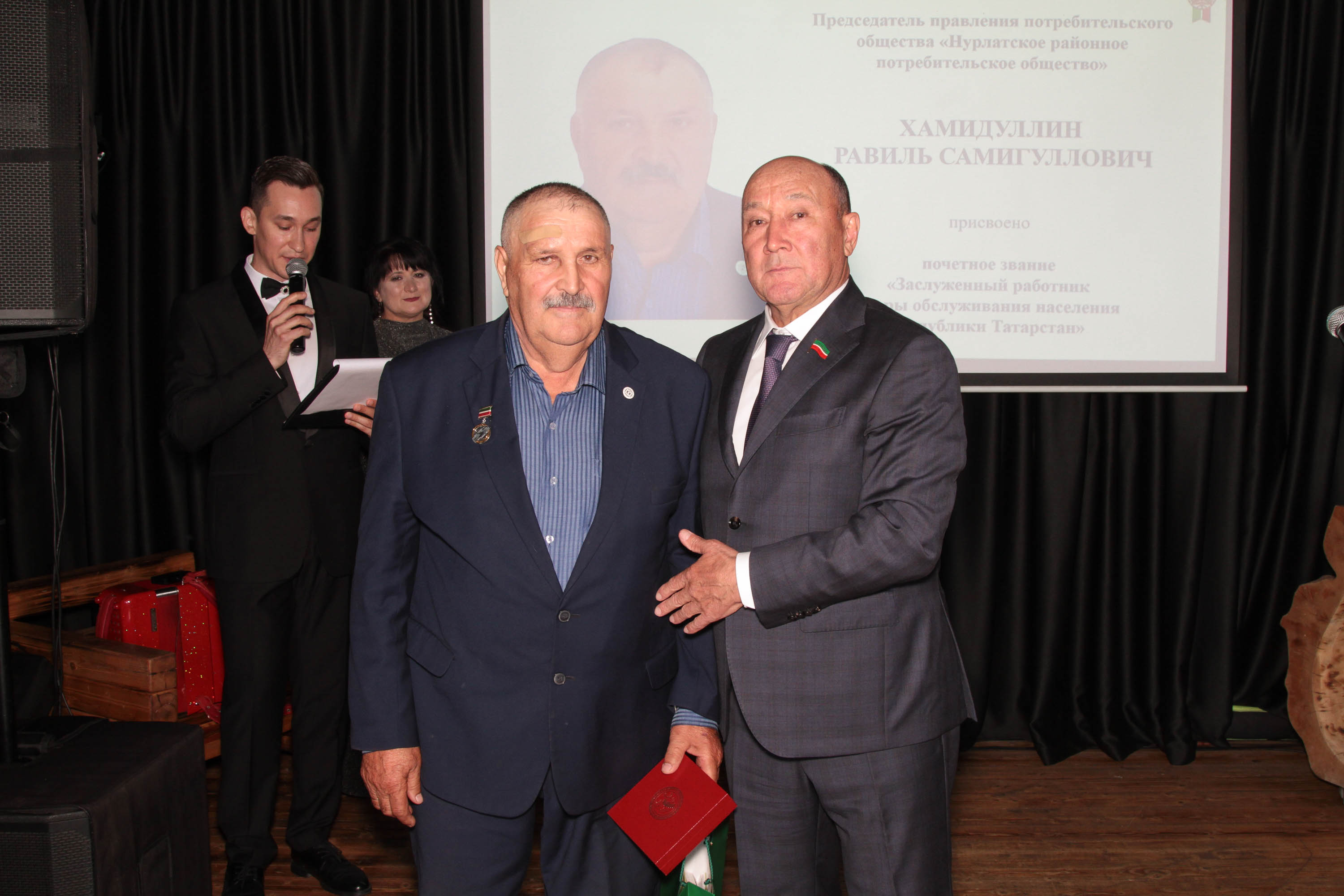 Председателю правления потребительского общества «Нурлатское районное потребительское общество» ХАМИДУЛЛИНУ РАВИЛЮ САМИГУЛЛОВИЧУ присвоено почетное звание «Заслуженный работник сферы обслуживания населения Республики Татарстан»