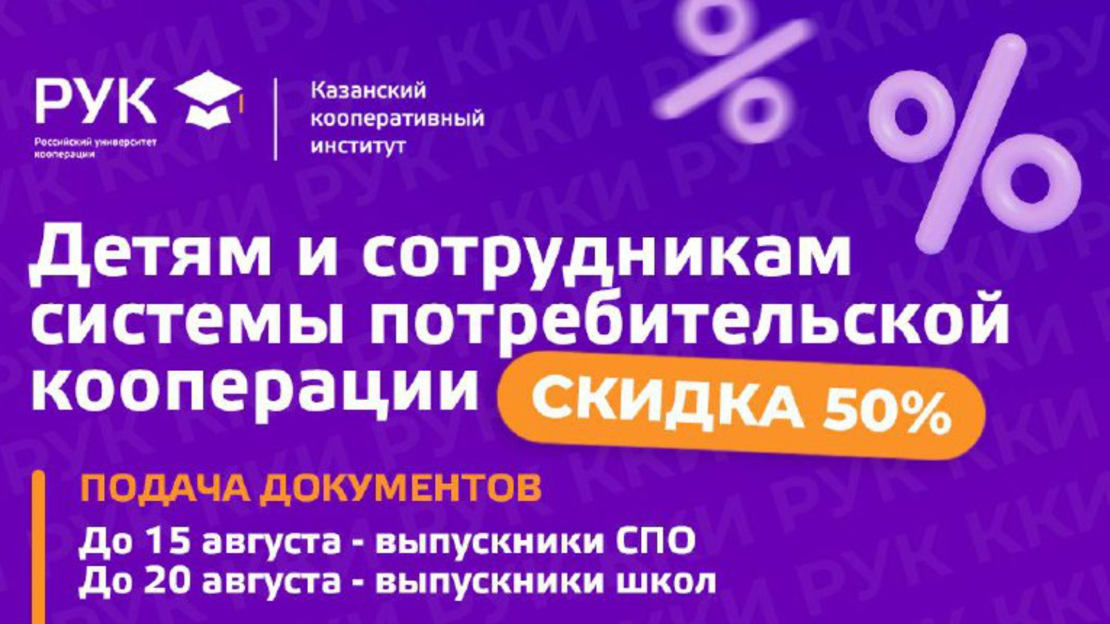 Станьте частью будущего — откройте новые горизонты вместе с ККИ РУК! Мы рады сообщить о нашей специальной программе, предлагающей 50% скидку на обучение для работников системы потребительской кооперации. Это отличная возможность улучшить свою квалификацию и получить доступ к качественному образованию.