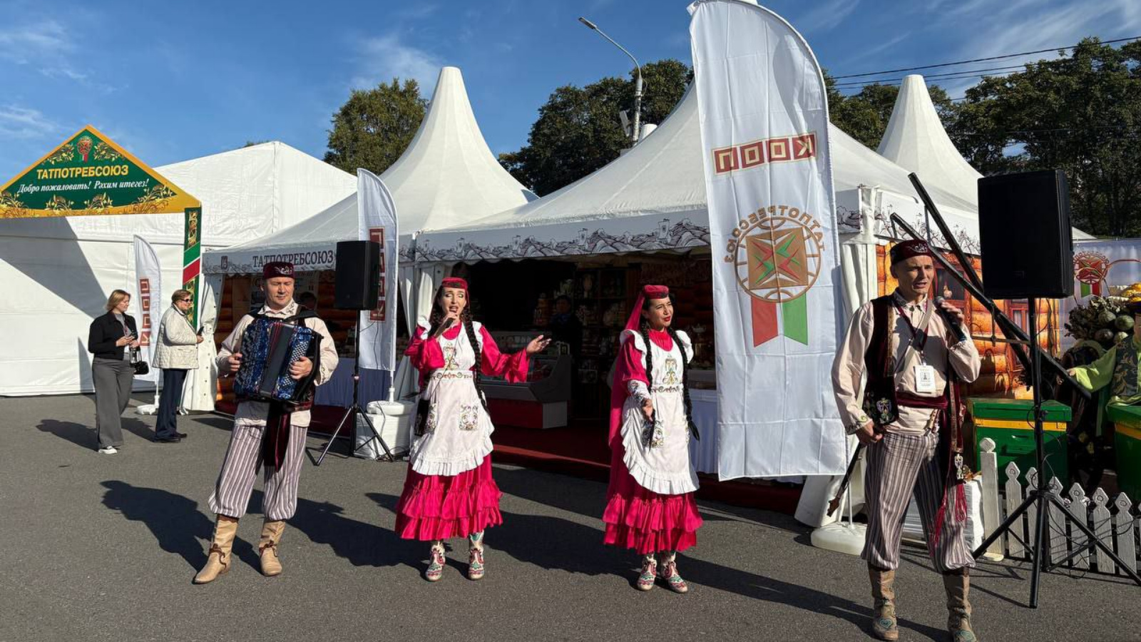На ярмарке Международного форума можно увидеть выступление ансамбля «Риваять» в национальных костюмах .