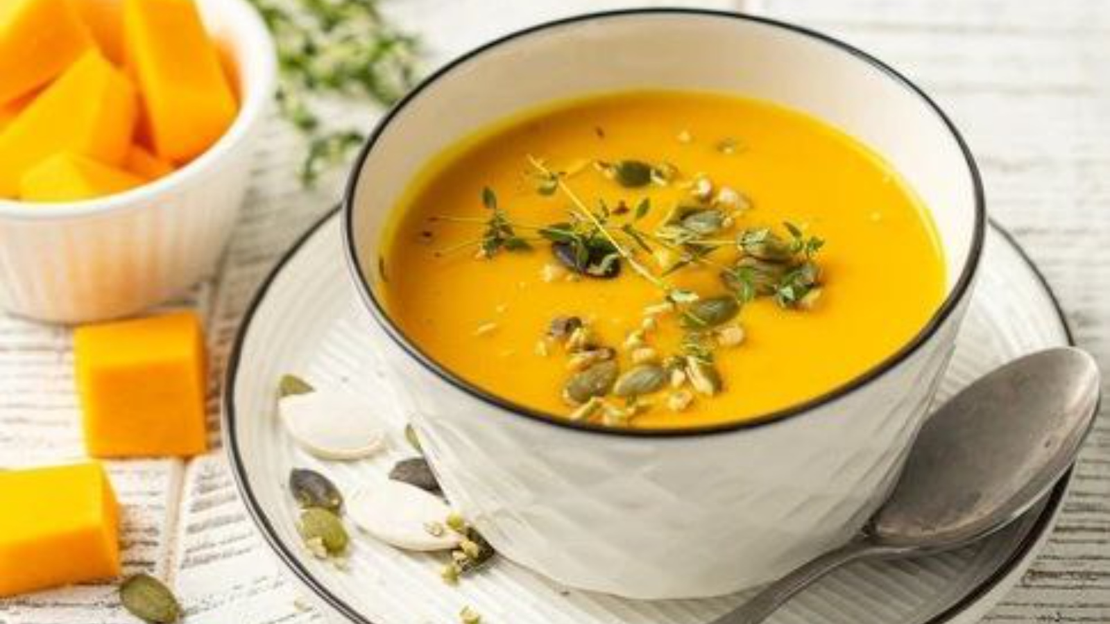 Готовый суп разливают по тарелкам, посыпают тыквенными семечками, тимьяном и подают к столу.
