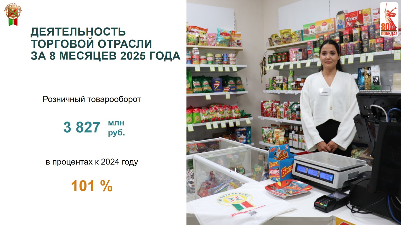 Организациями потребительской кооперации через сельские торговые объекты за восемь месяцев текущего года реализовано товаров на сумму более 3,8 млрд рублей, с ростом 1 % к уровню прошлого года.