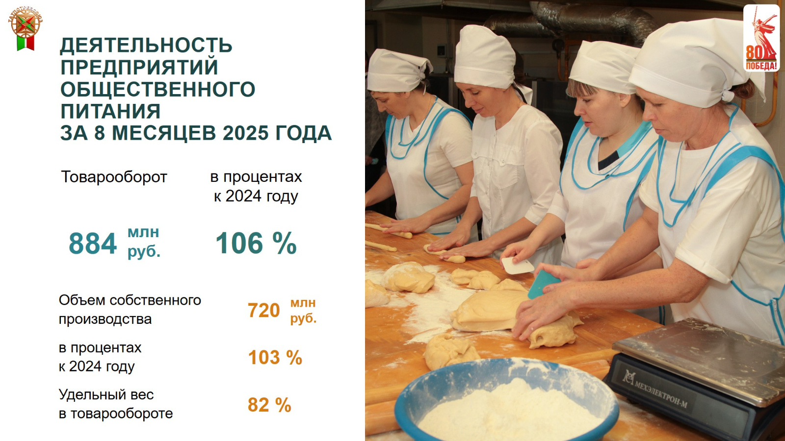 В отрасли общественного питания за восемь месяца обеспечен товарооборот в сумме 884 млн рублей с ростом к уровню прошлого года на 6 %. Объем реализованной продукции собственного производства составил более 720 млн рублей (рост 3 %).