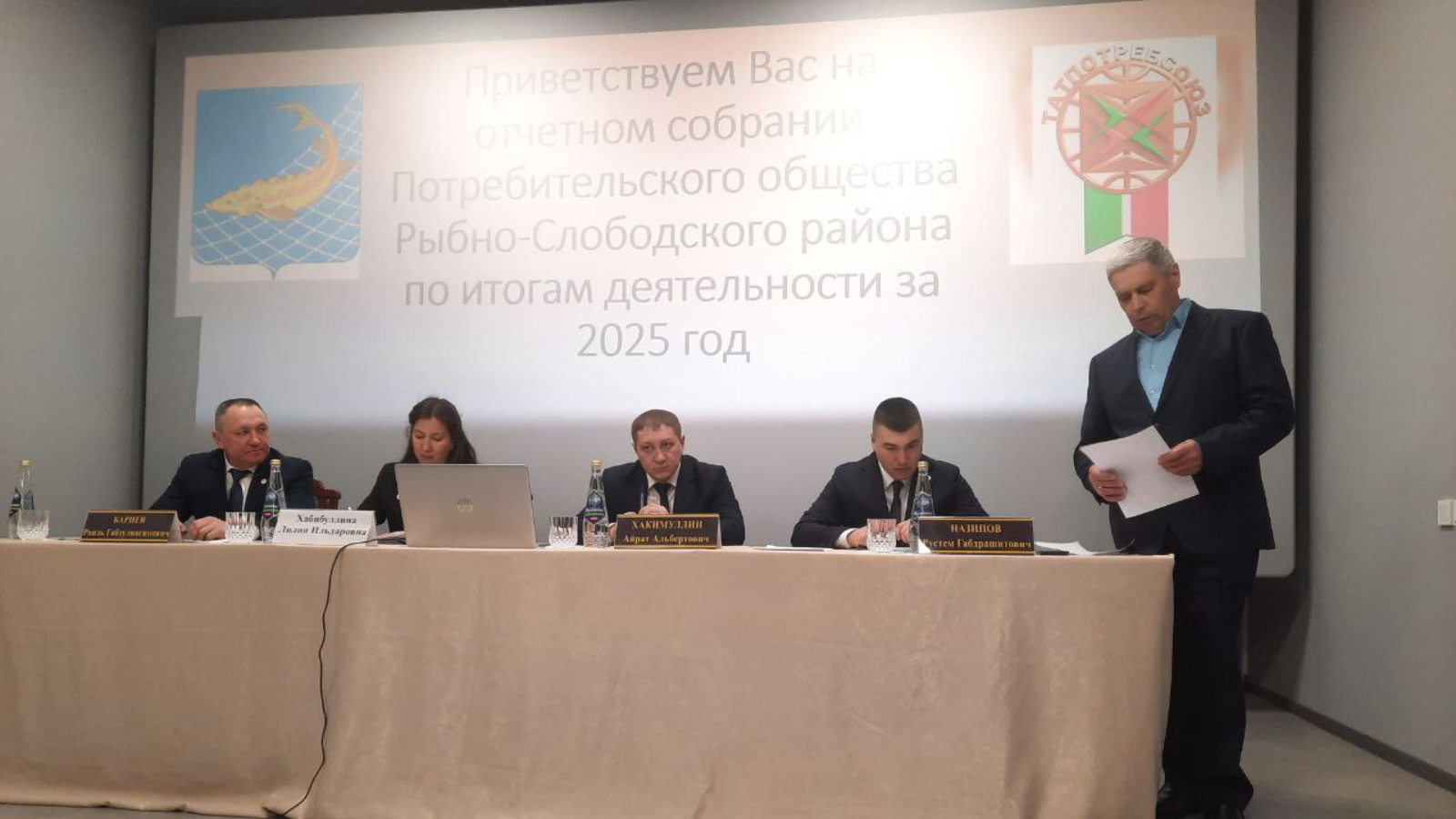 В Рыбной Слободе состоялось отчетное собрание. В нем участвовали заместитель председателя правления-главный бухгалтер Лилия Хабибуллина, заместитель руководителя Исполнительного комитета Рыбно-Слободского муниципального района по экономическим вопросам Айрат Хакимуллин,председатель правления ПО "Кама-АА" Александр Романов и председатель правления ПО "Кама" Раиль Бариев, уполномоченные пайщики, руководители и специалисты райпо, представители муниципальных образований сельских поселений.