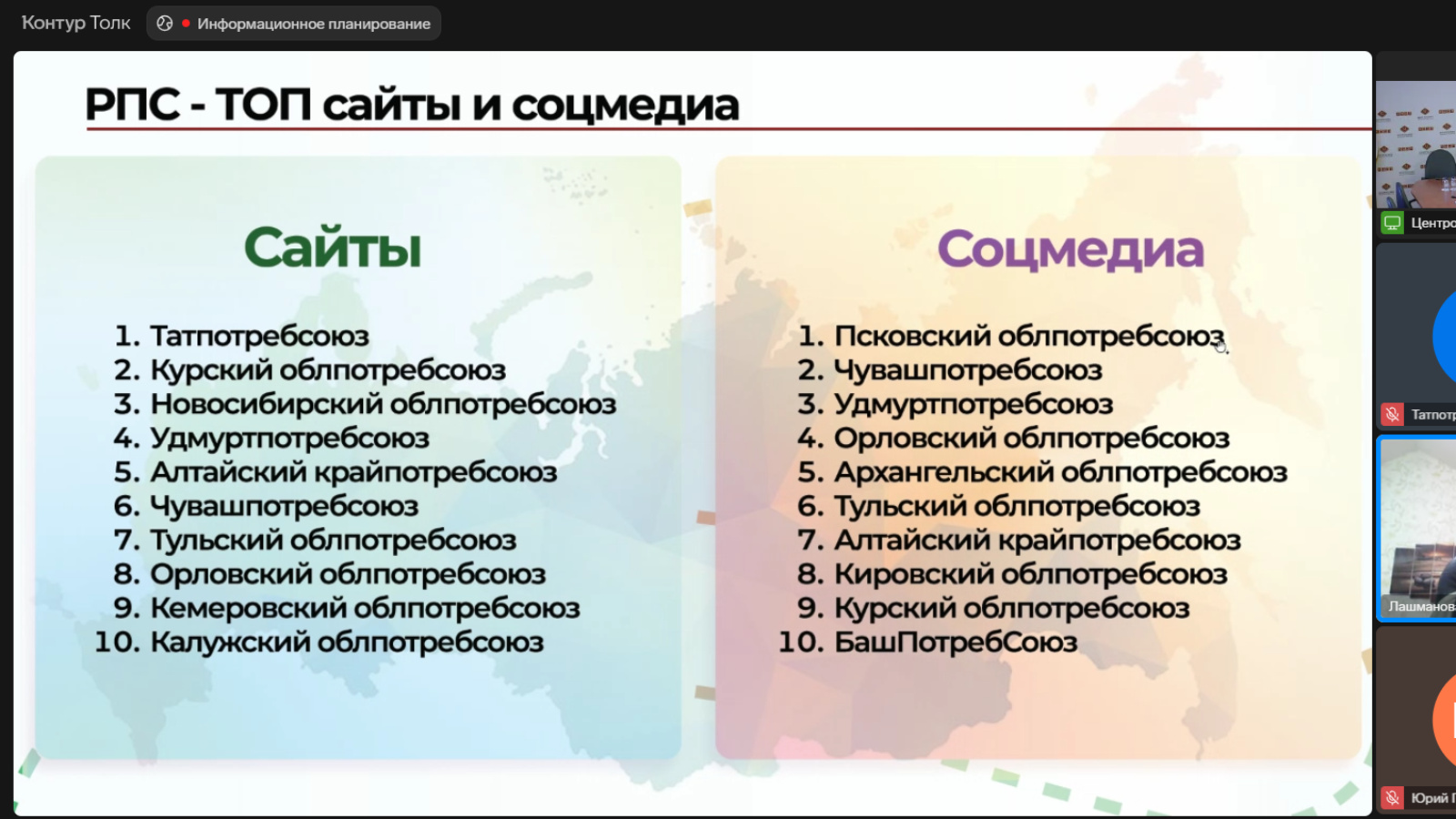 Элина Гусарова подытожила итоги информационной деятельности за прошедший месяц, представив подробный анализ рейтингов (ТОП) сайтов и страниц «ВКонтакте» СМИ районных потребительских обществ регионов. Рейтинг выявил лидеров по охвату аудитории и качеству контента.