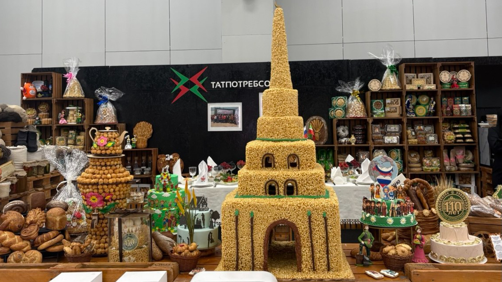 На площадке выставки «Казань Агро – 2026» особое внимание гостей привлекла экспозиция Татпотребсоюза, где была представлена необычная и по-настоящему впечатляющая работа — башня Сююмбике, выполненная из национального татарского лакомства чак‑чак.