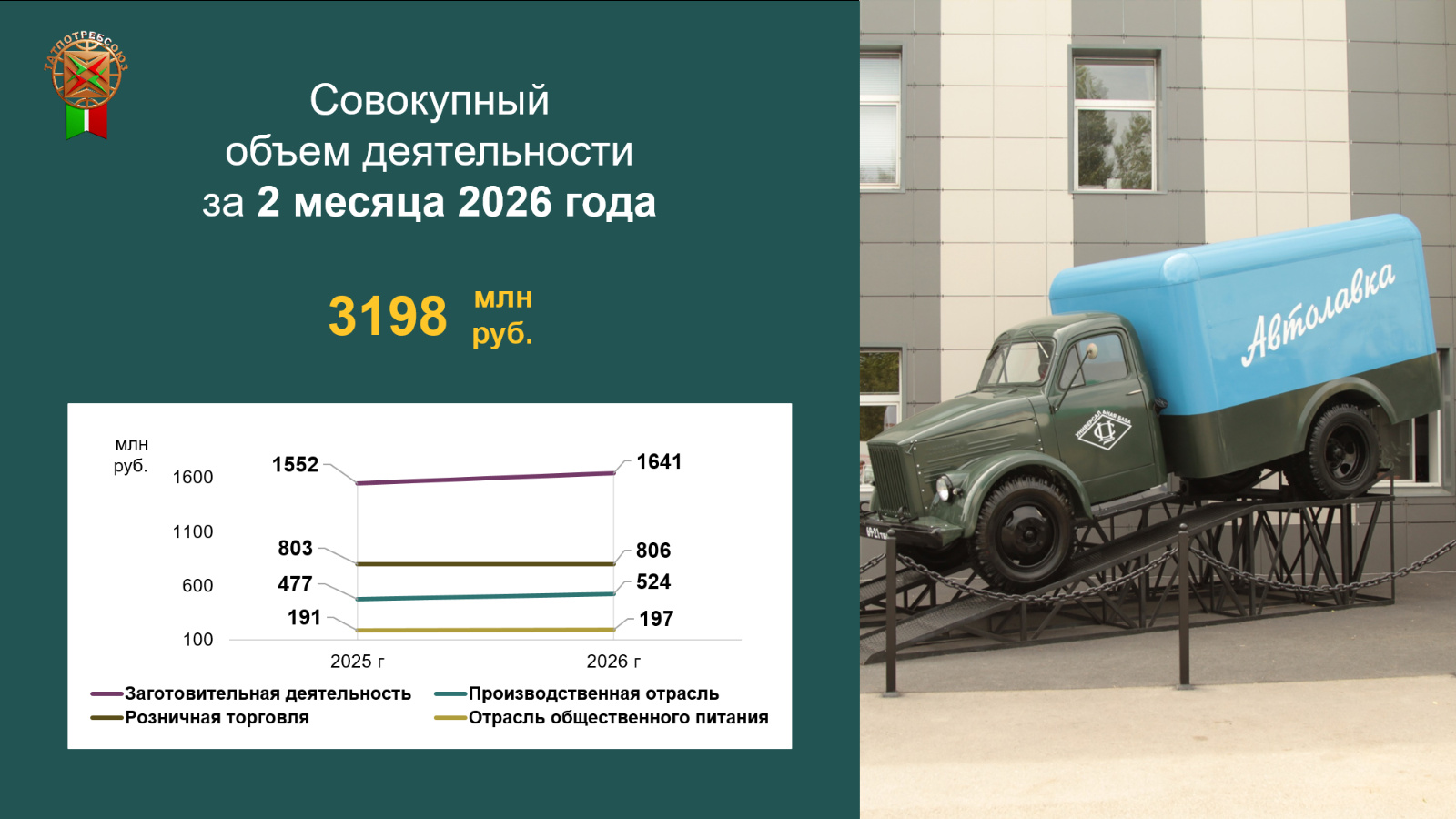 Совокупный объем деятельности оказываемых услуг организациями потребительской кооперации за два месяца 2026 года составил более 3 млрд рублей, с ростом на 5% к уровню прошлого года.